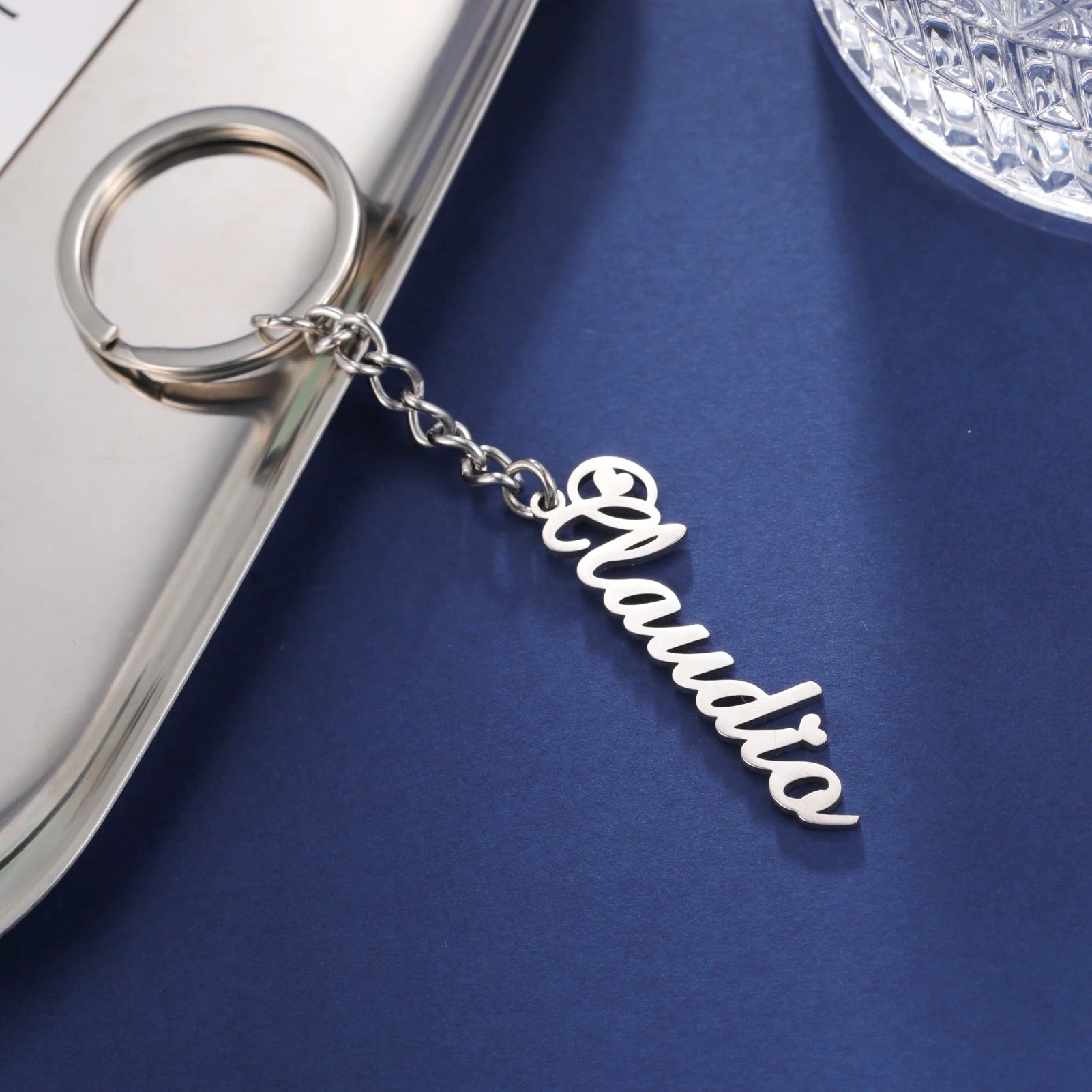 This custom keychain is made of high-quality stainless steel and can be engraved with a name or initial. Perfect as a gift for bridesmaids or friends.