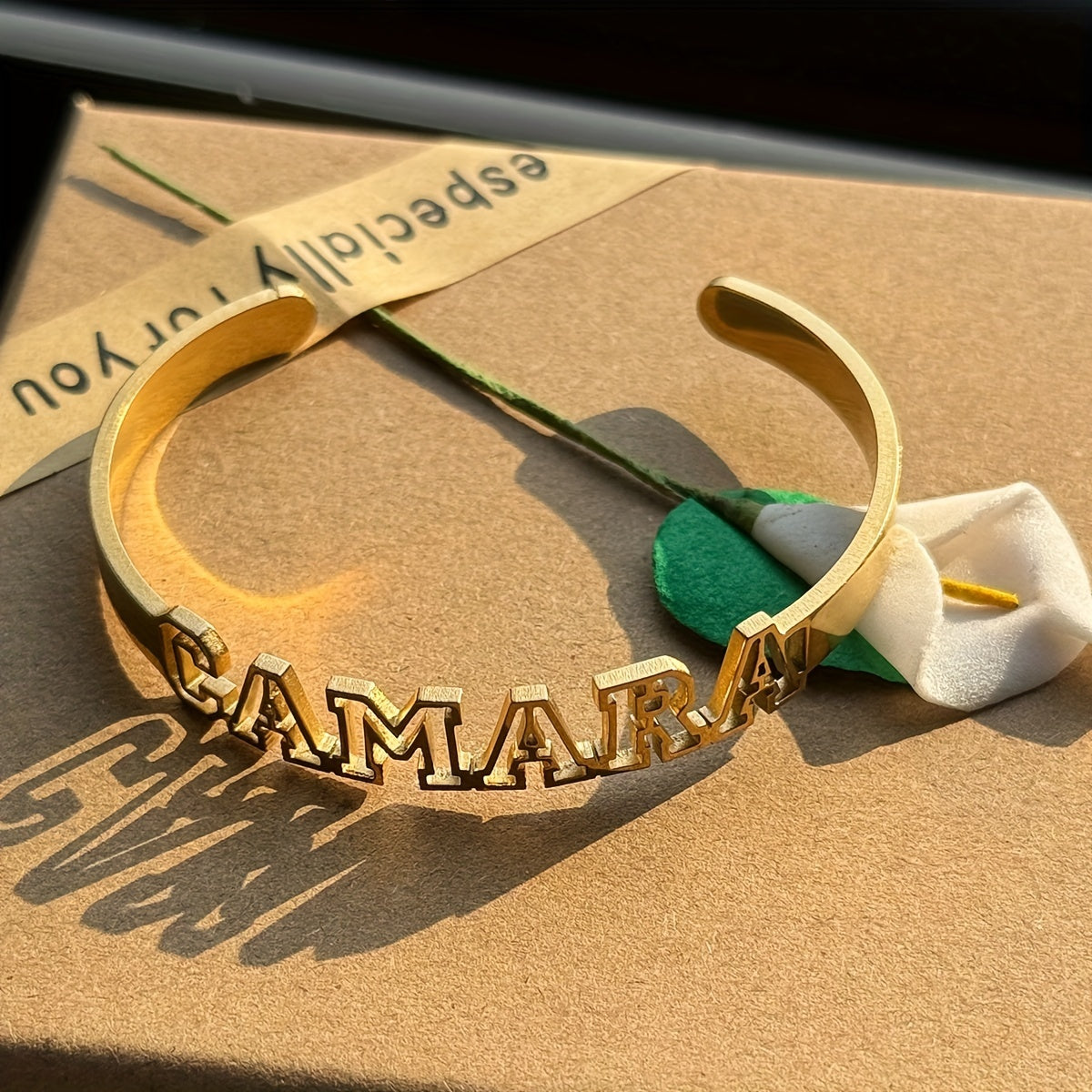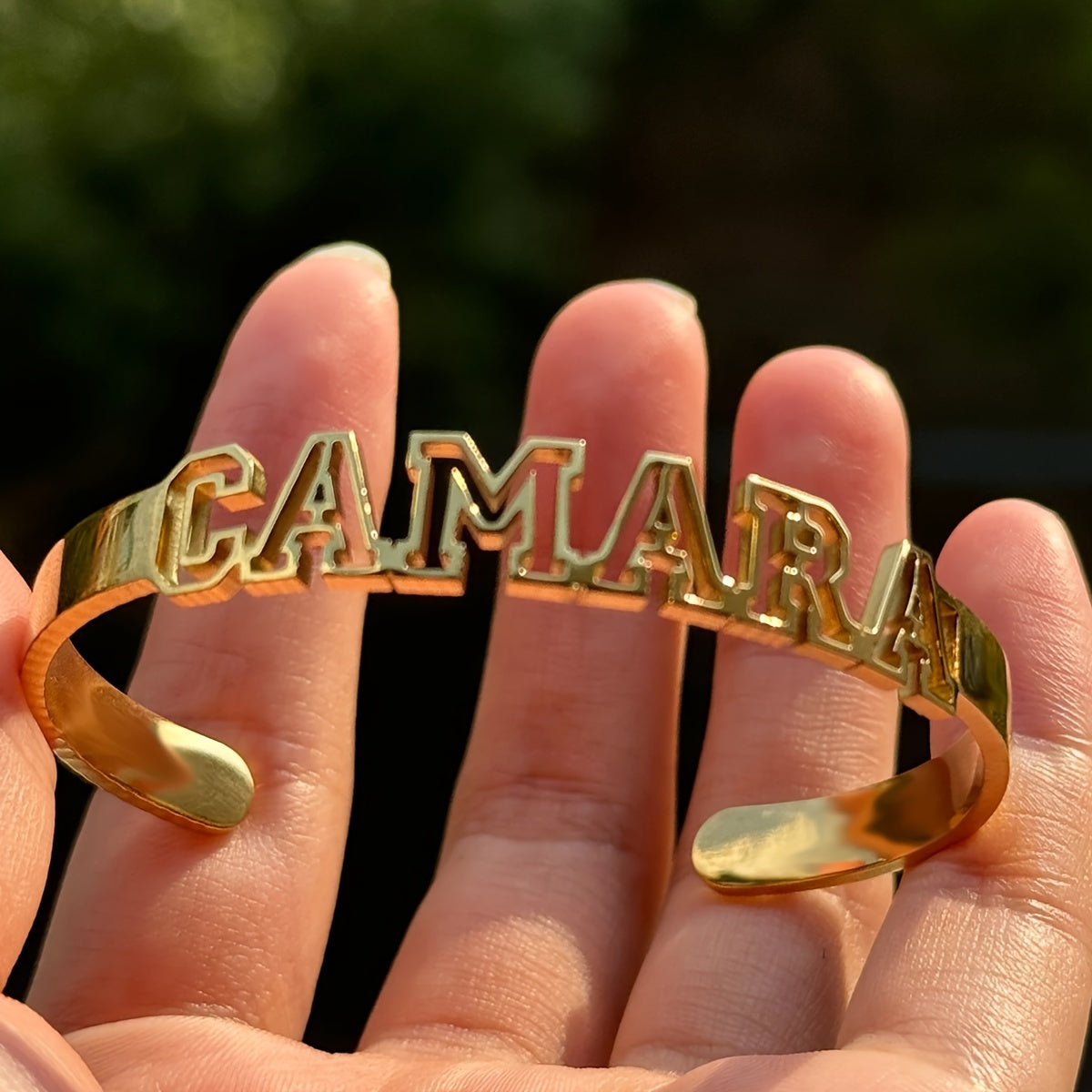 Add a personal touch to your style with this adjustable cuff bracelet featuring your custom name. Made with high-quality 18K gold plating, this bangle is the perfect accessory for any outfit.