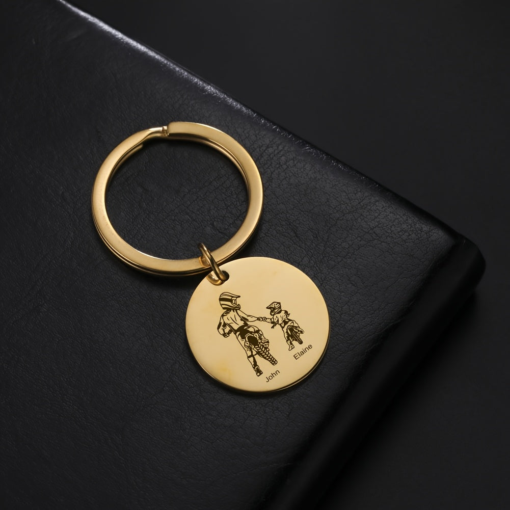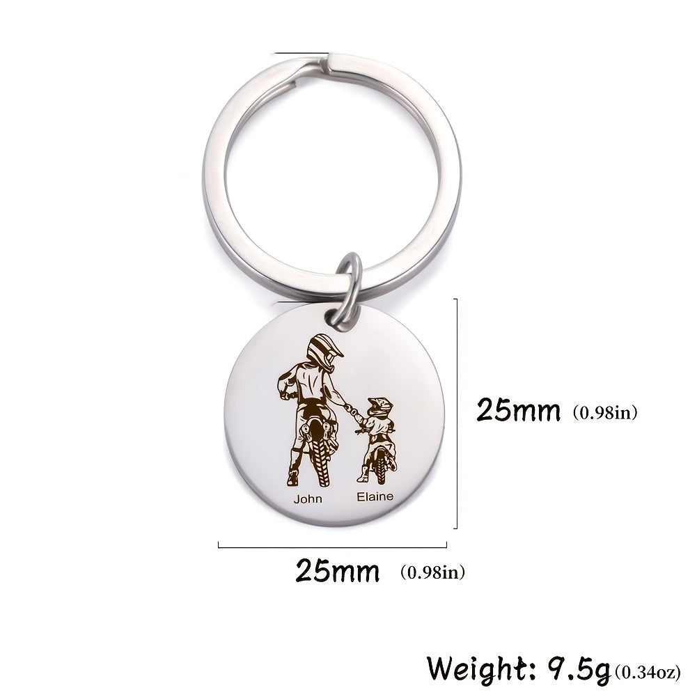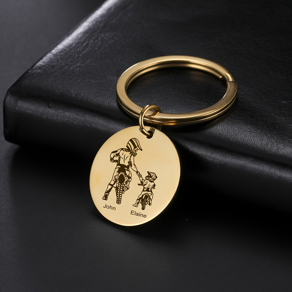 Custom keychain featuring a round plate pendant with engraved father and son motorcycle design. Add names for a personal touch.