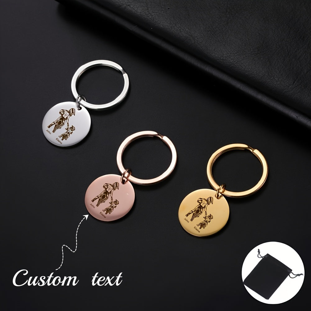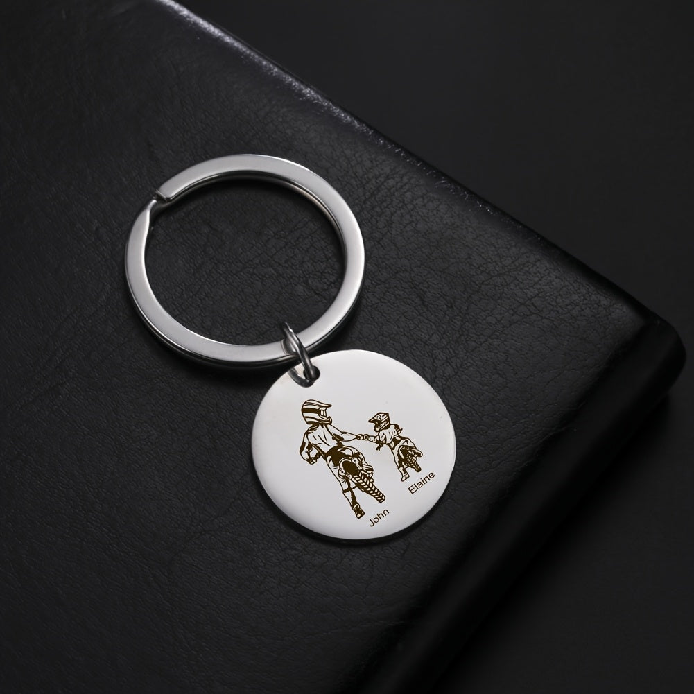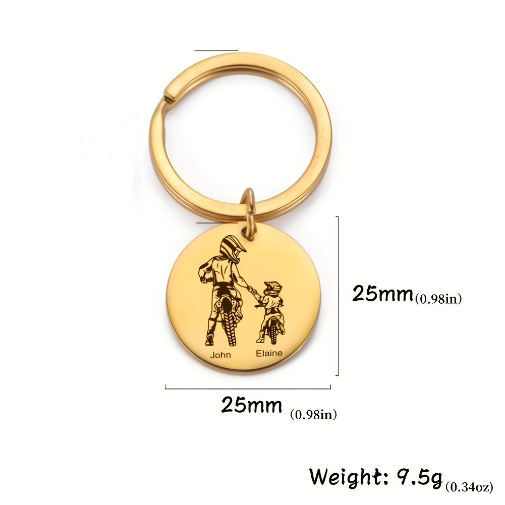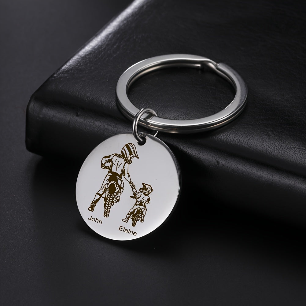 Custom keychain featuring a round plate pendant with engraved father and son motorcycle design. Add names for a personal touch.