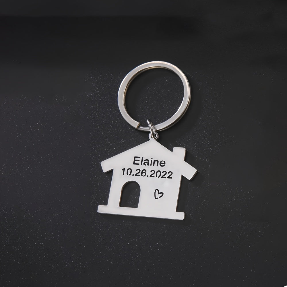Fashionable DIY lettering key ring made of stainless steel in a house-shaped design. Custom engraving with a name and date makes it a perfect Christmas gift for women.