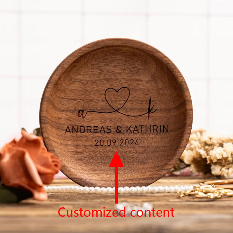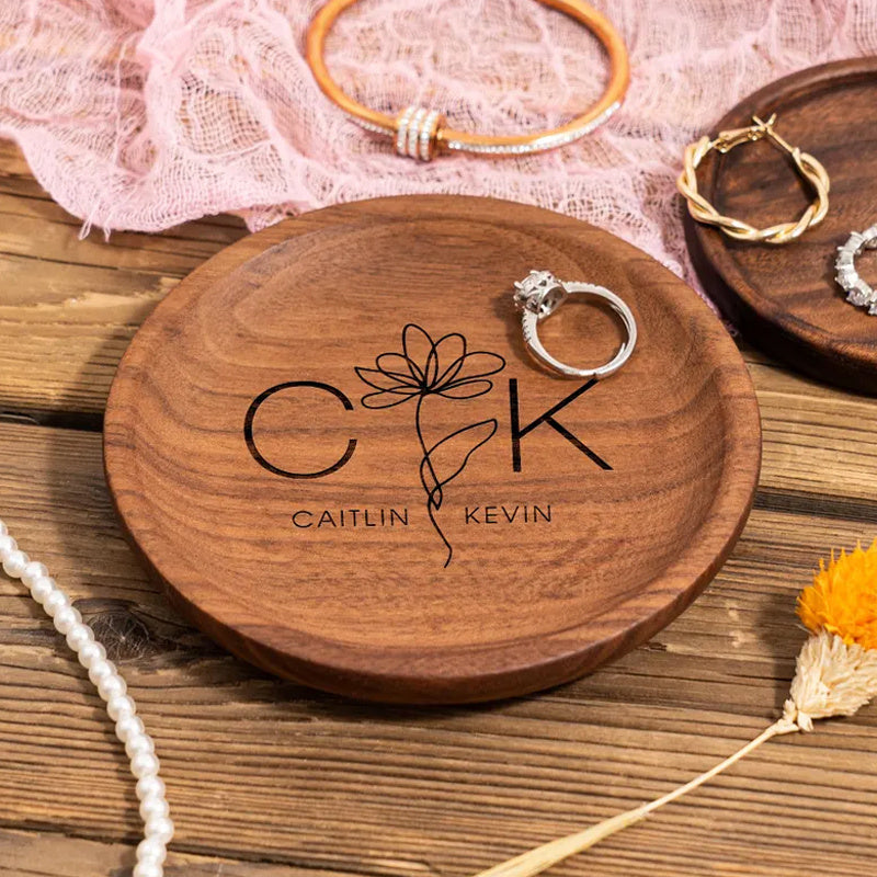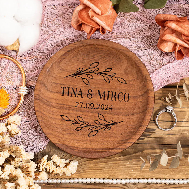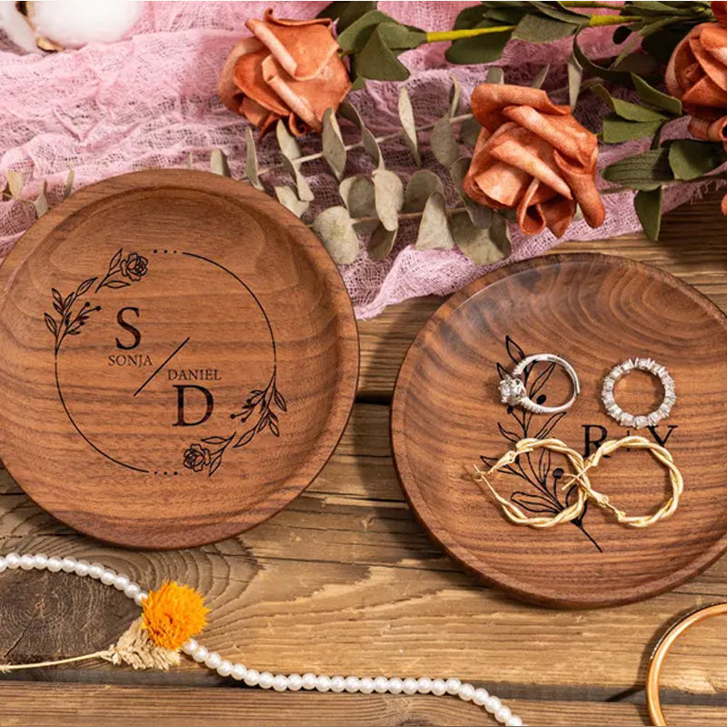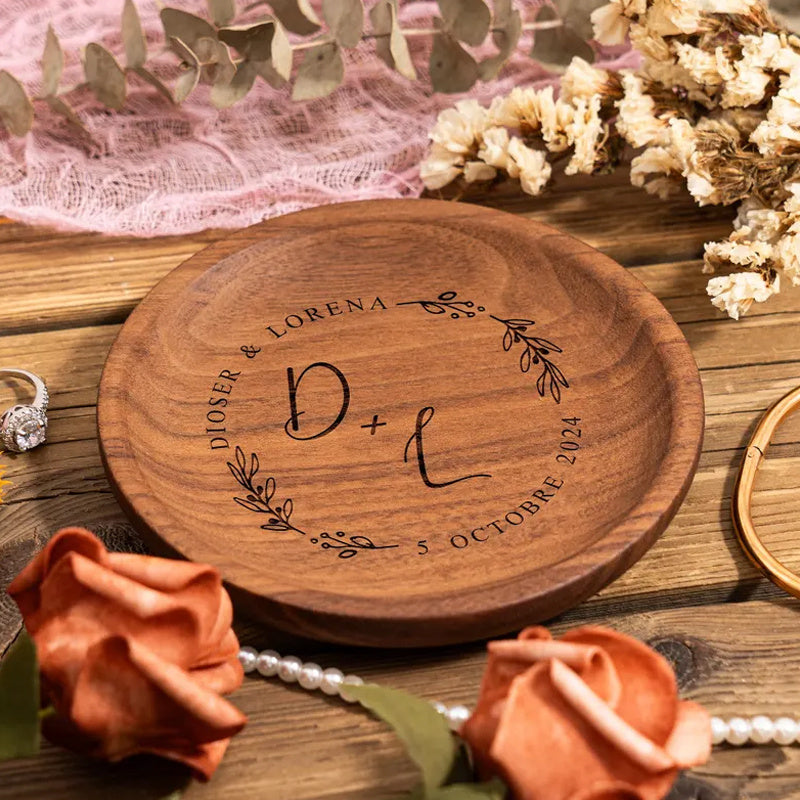 Custom engraved round desktop organizer ideal for rings, earrings, and necklaces. Perfect for wedding anniversaries.