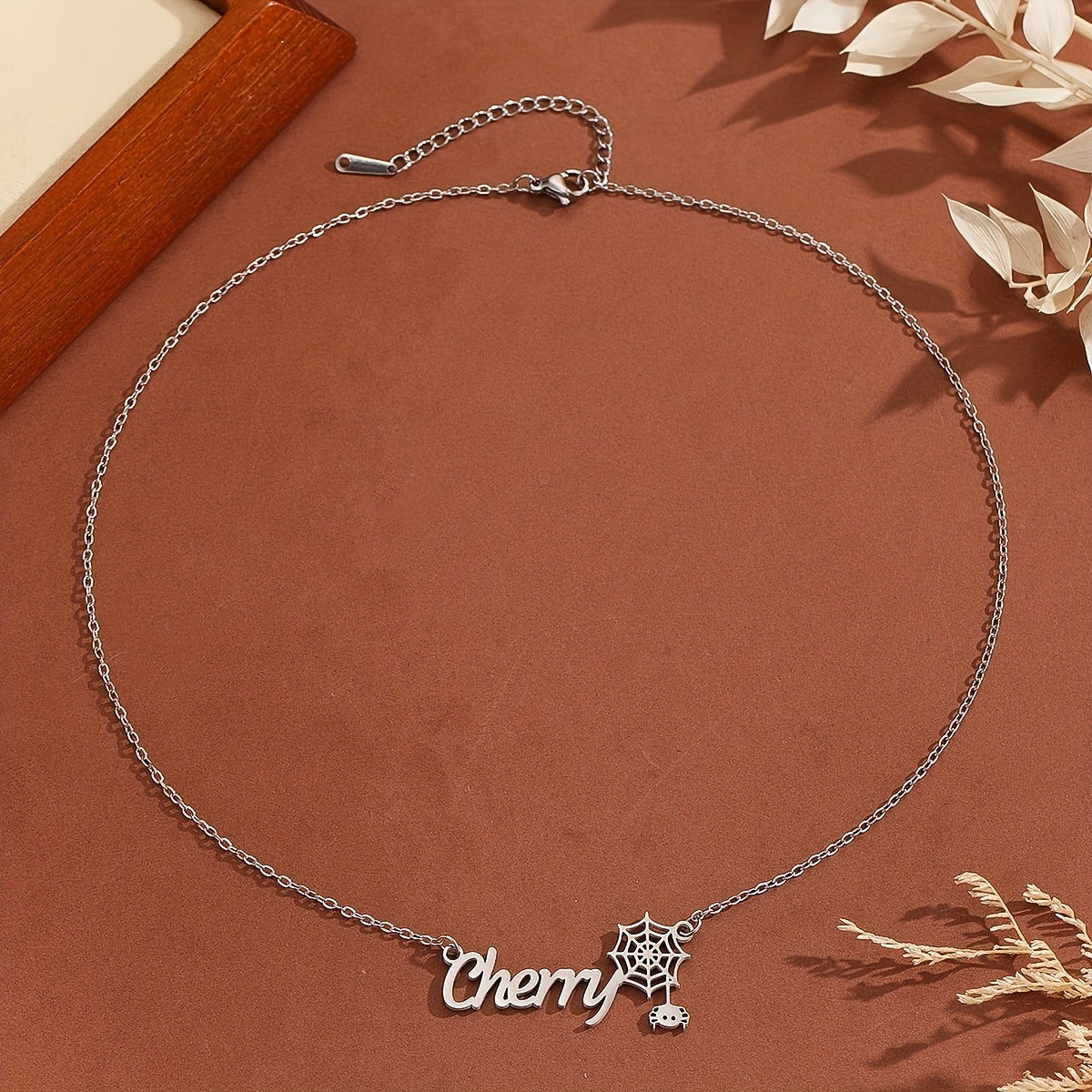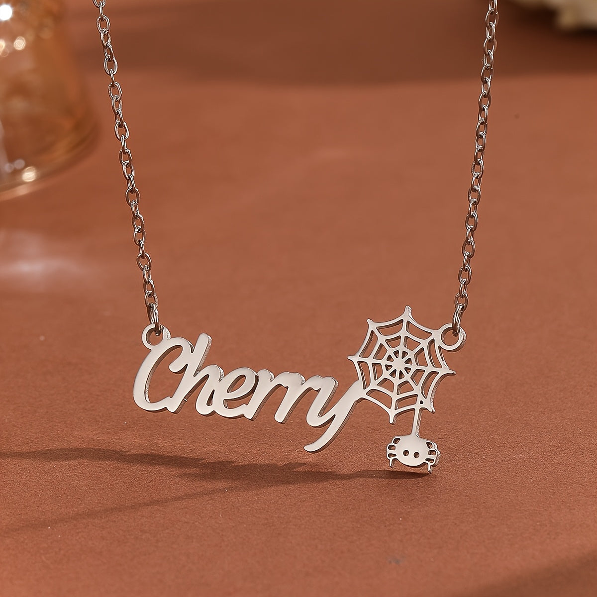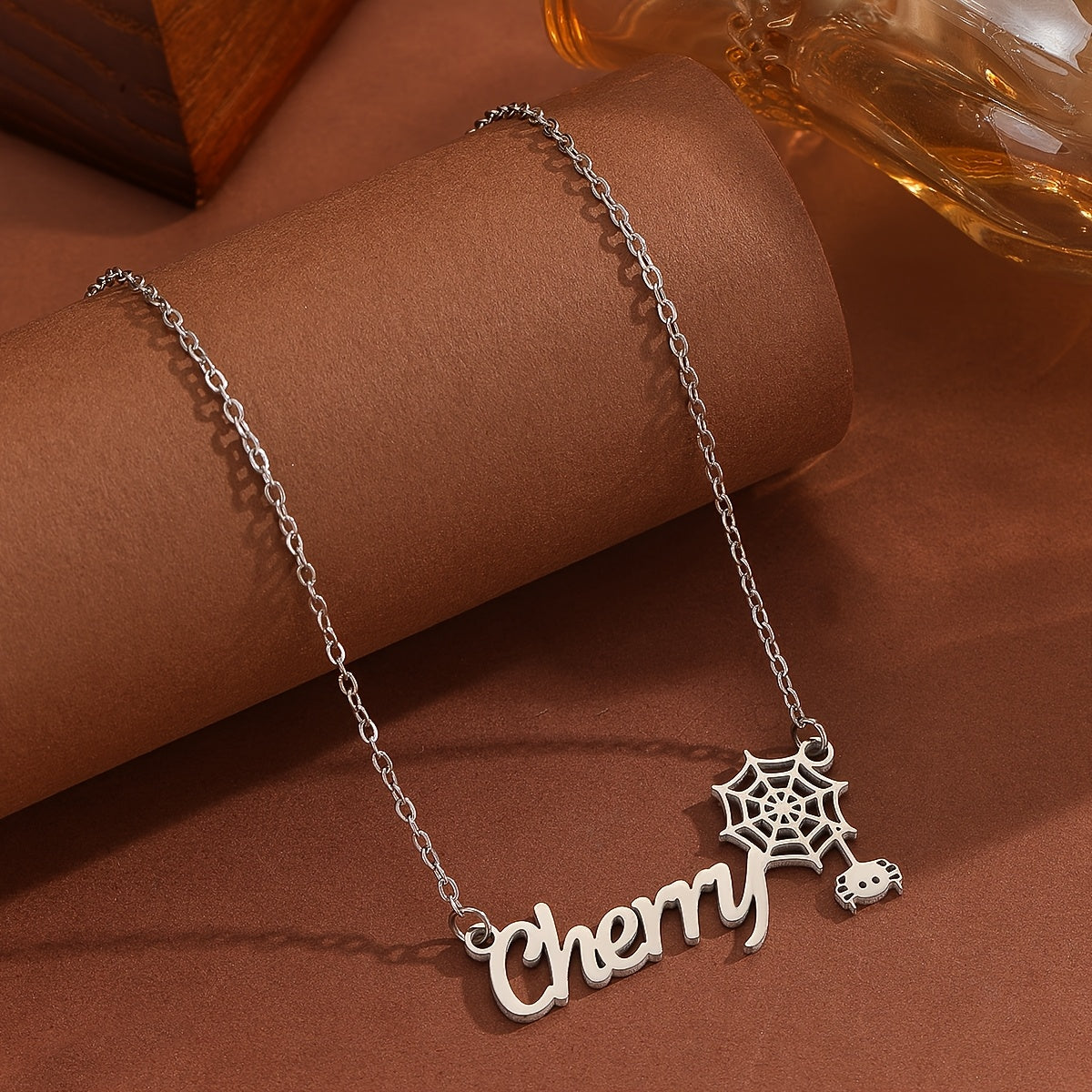 This personalized stainless steel jewelry features a spider and cobweb design with a stylish font, suitable for men and women.