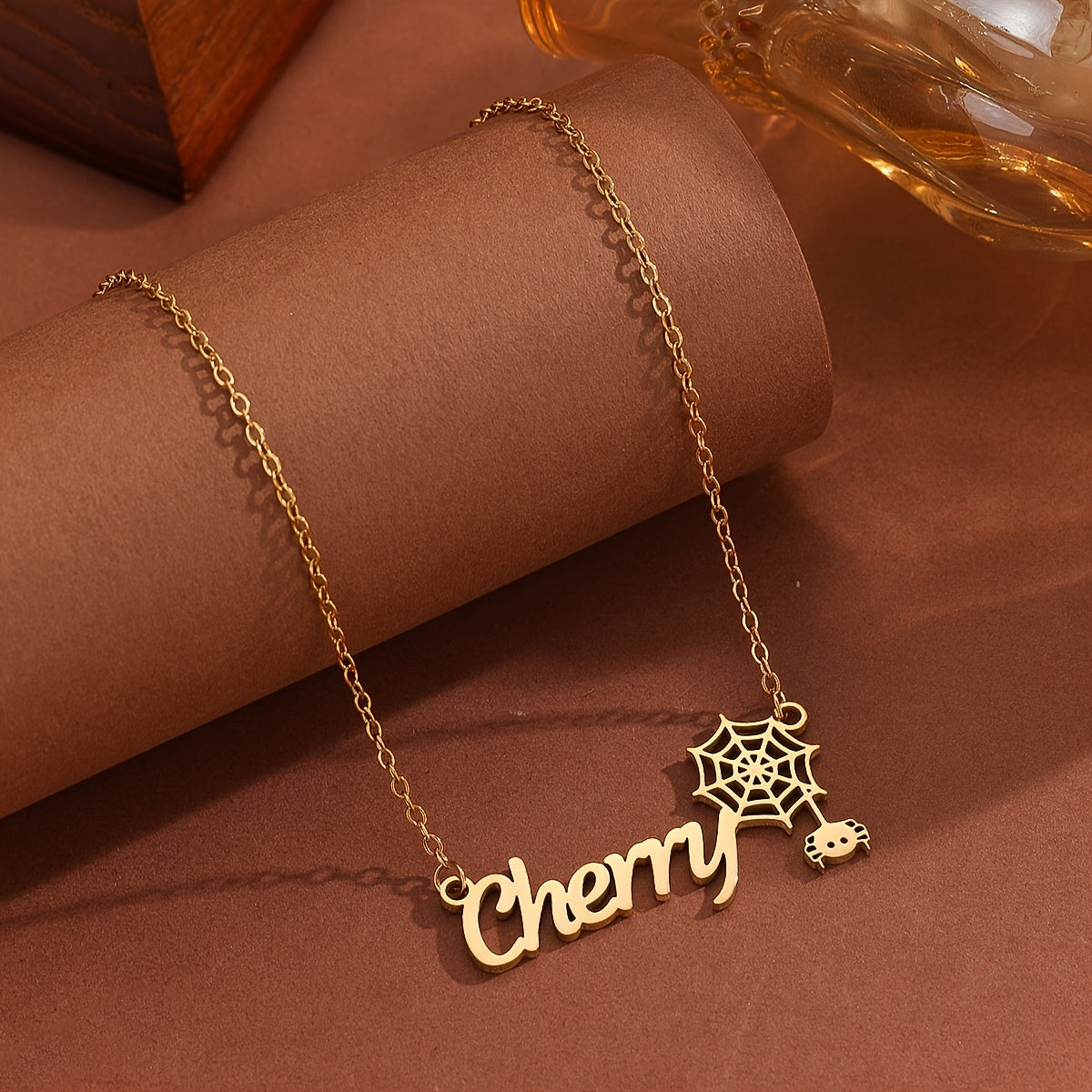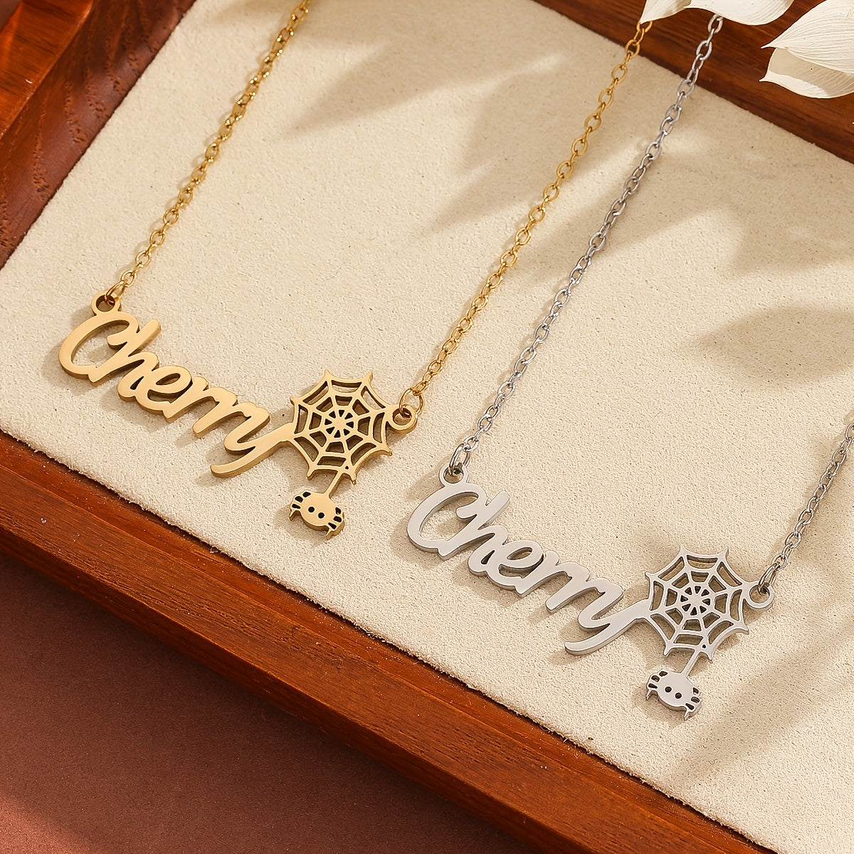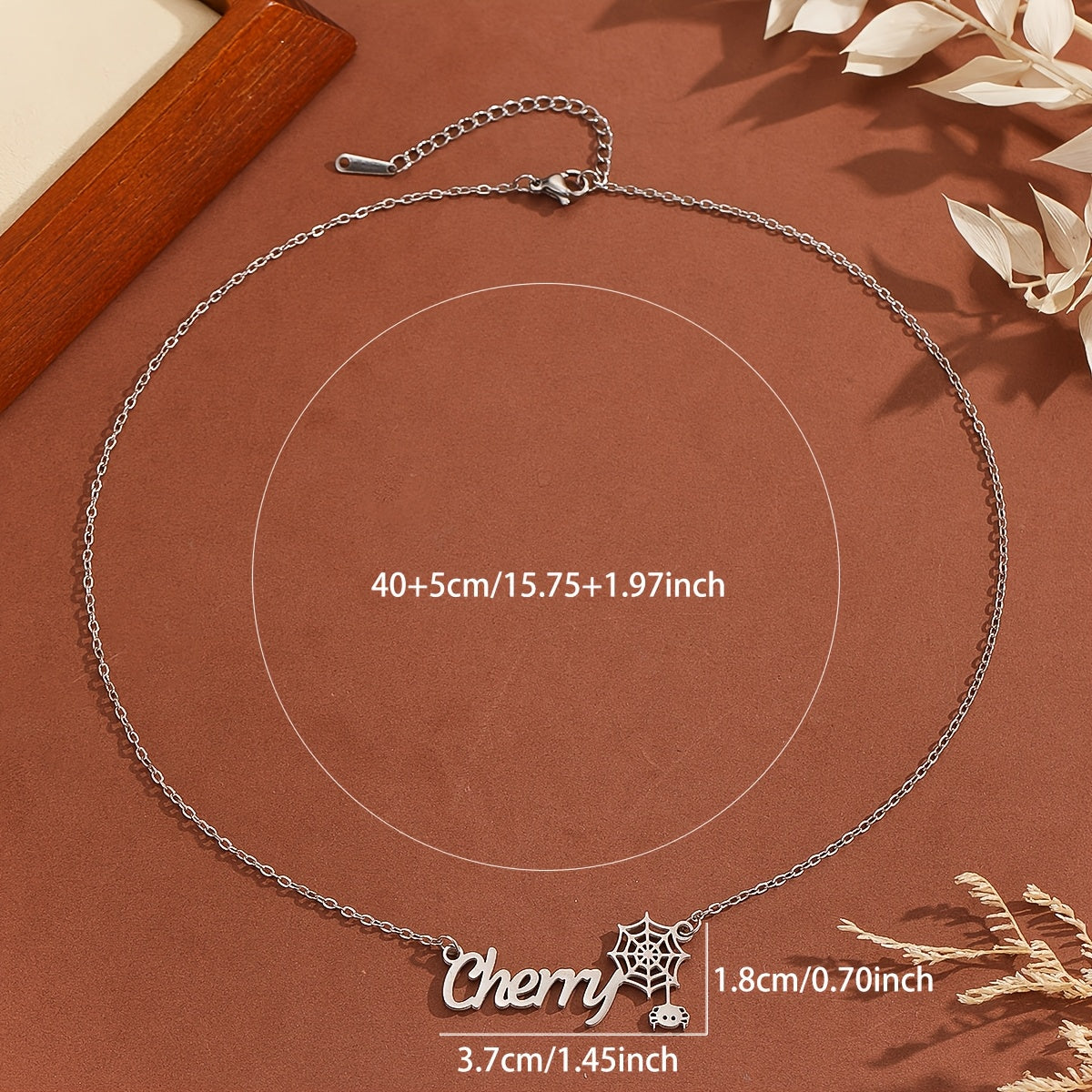 This personalized stainless steel jewelry features a spider and cobweb design with a stylish font, suitable for men and women.