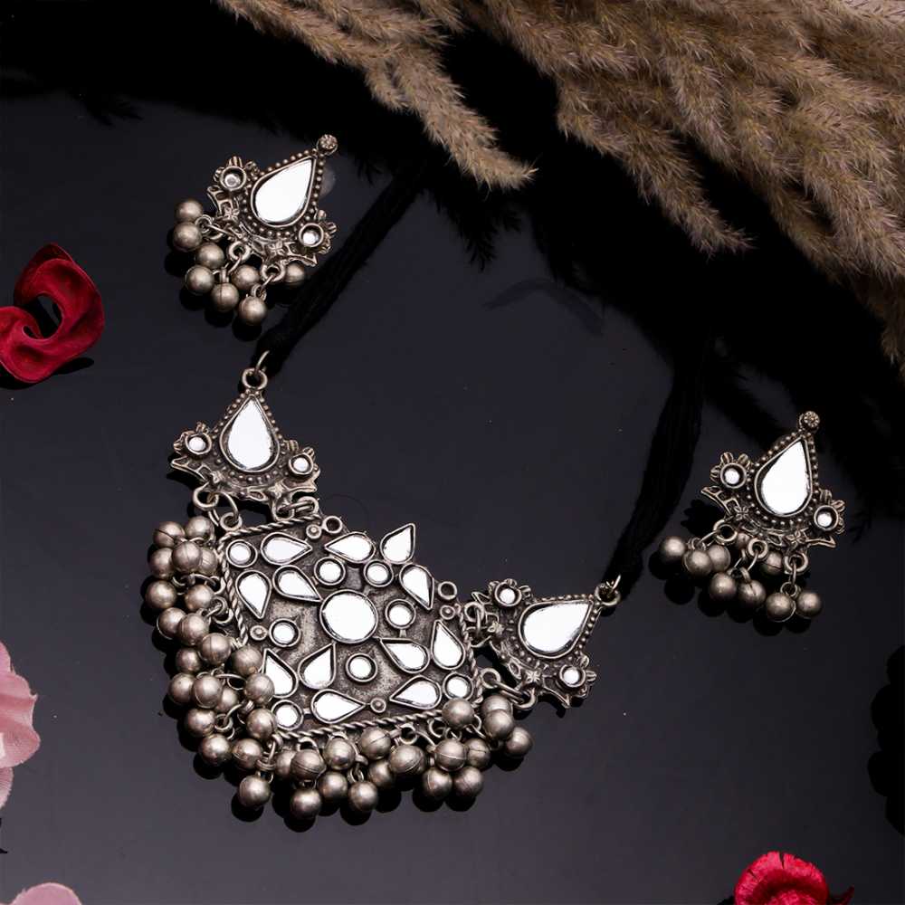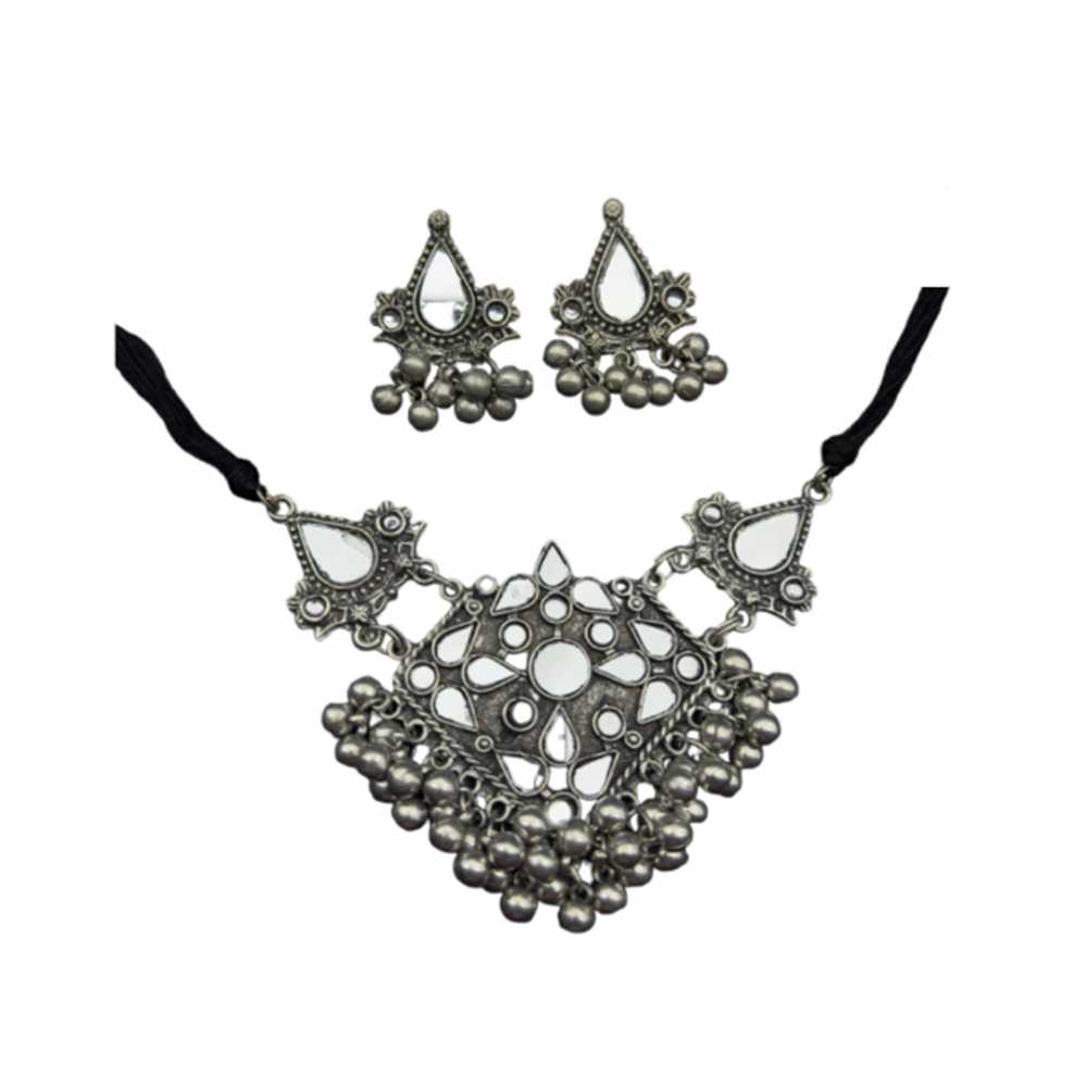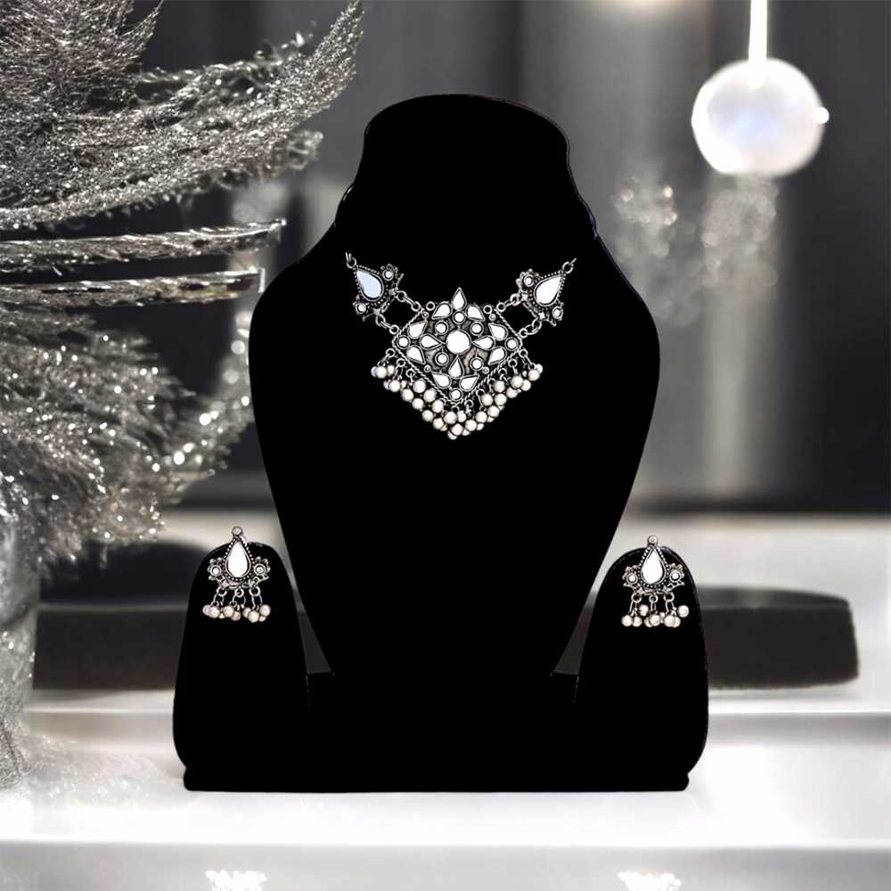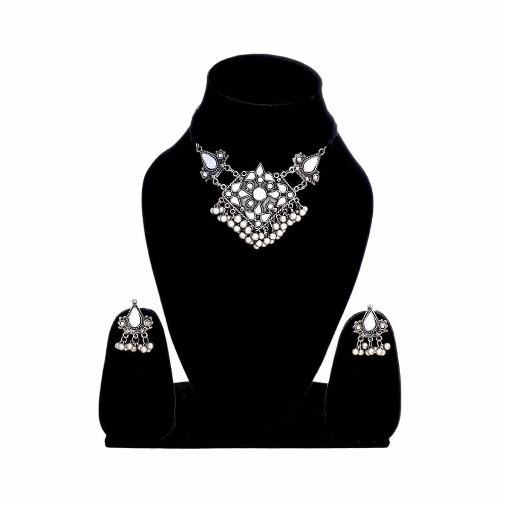 - Détails du produit : Cet ensemble de bijoux en miroir est fabriqué à partir d'un matériau de haute qualité plaqué argent oxydé et parsemé de perles.