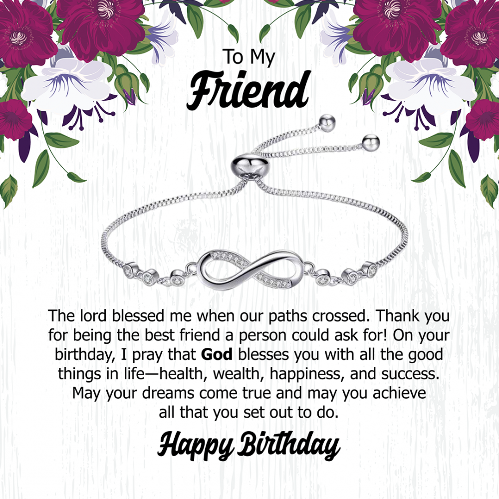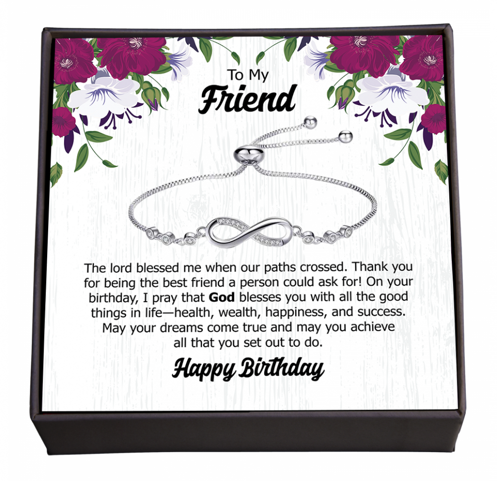Bling Queen est une marque de bijoux fantaisie abordable proposant une variété de produits, tels que bracelets, colliers, boucles d'oreilles, bagues, etc., pour femmes, hommes et enfants. « Une amitié bénie : Je vous souhaite une année de joie et de succès » est un charmant bracelet infini conçu pour célébrer le lien privilégié qui unit les amis. Ce bijou exquis est un témoignage sincère de votre reconnaissance et de votre soutien, ce qui en fait un cadeau idéal pour les anniversaires, les événements marquants ou tout simplement pour témoigner votre affection. Accompagné d'un petit mot, il souhaite à votre ami une année remplie de joie et de succès. Célébrez votre amitié et les beaux moments partagés avec ce souvenir précieux qui reflète votre amour et vos encouragements.