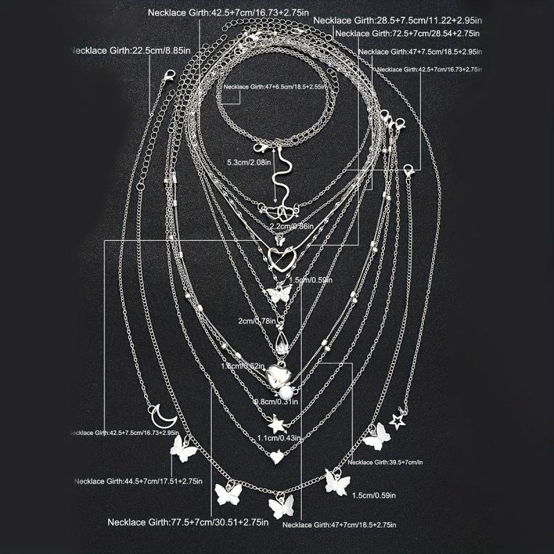 This stunning necklace set features 11 different pendants including hearts, snakes, butterflies, moons, stars, and drops. Perfect for vacation, date nights, everyday wear, anniversaries, or holiday gifts.