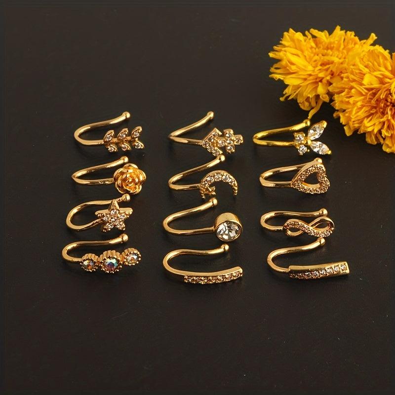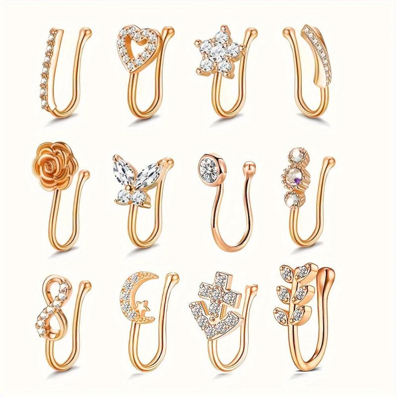 Enhance your style with this set of 12 vintage copper faux nose cuffs featuring synthetic zirconia inlay in star, flower, leaf, and heart shapes. Perfect for daily wear and vacations.