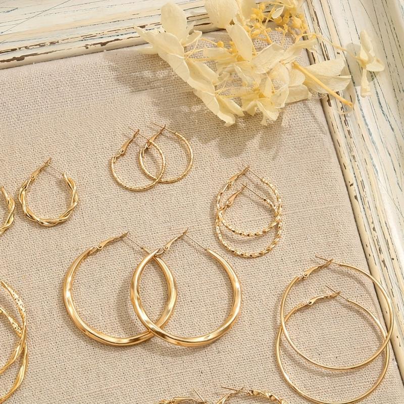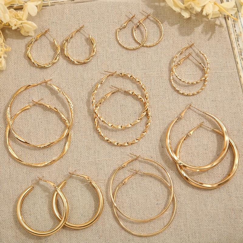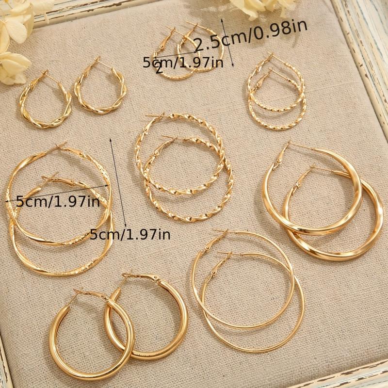 This stylish set of hoop earrings features a variety of geometric and twisted designs, perfect for daily wear or parties. Made of alloy with stainless steel posts, these earrings are versatile and quirky.