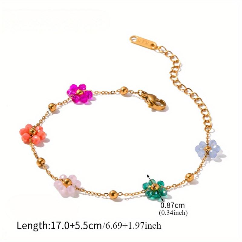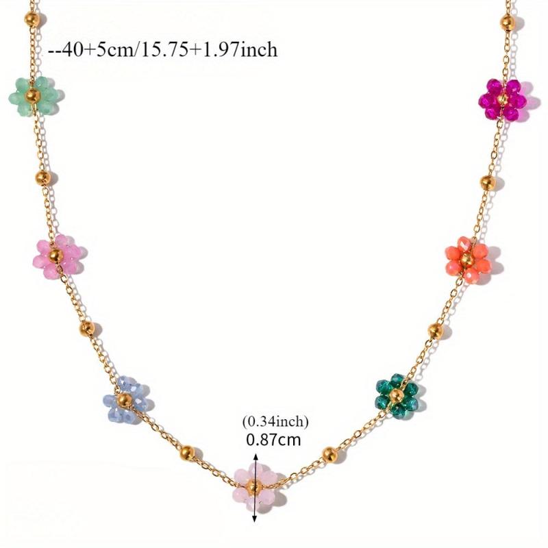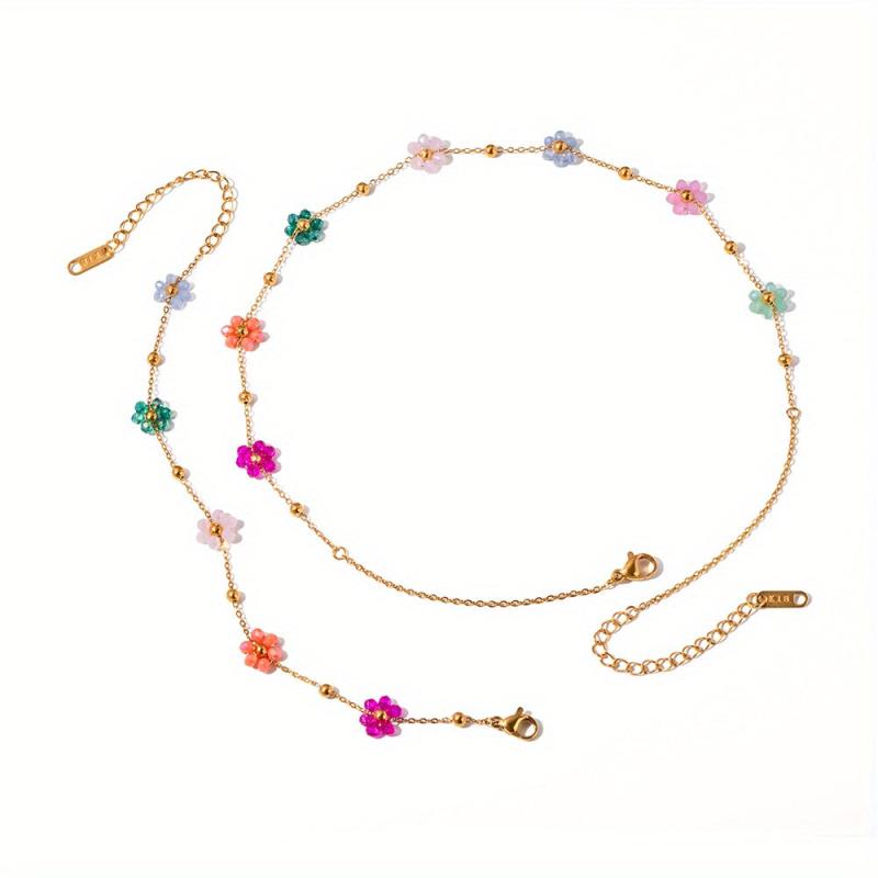 Elevate your look with this stunning 18K gold plated stainless steel necklace and bracelet set featuring colorful floral charms. Perfect for vacation, beach outings, and special occasions.