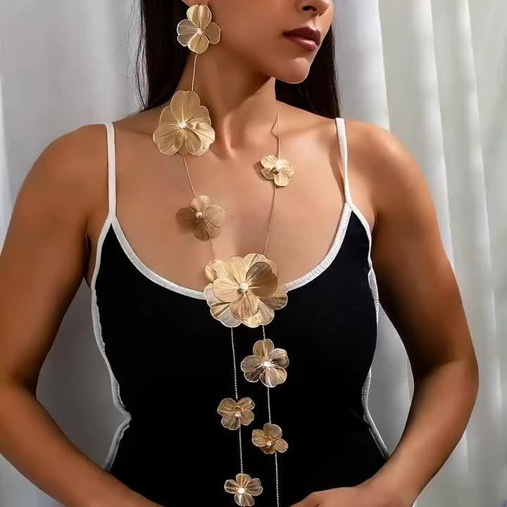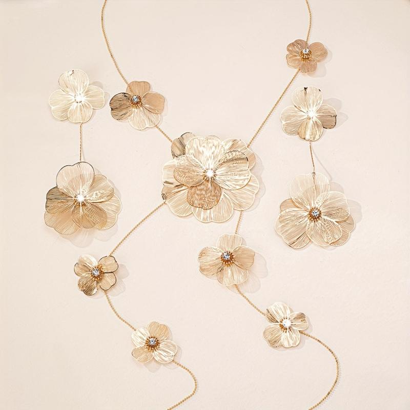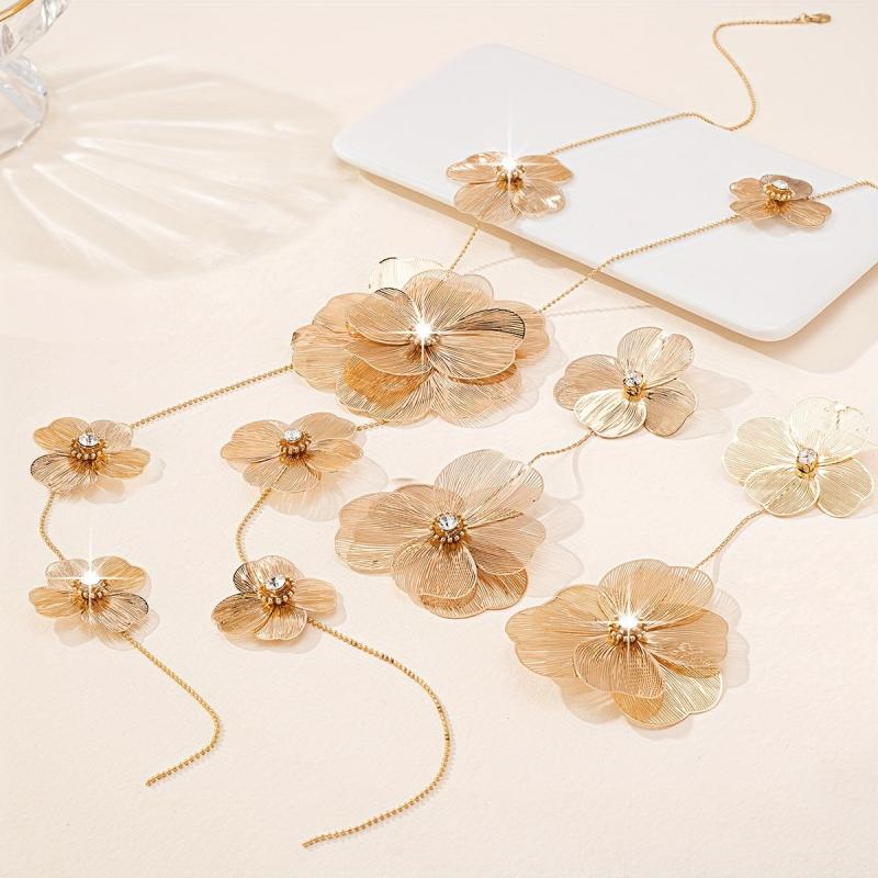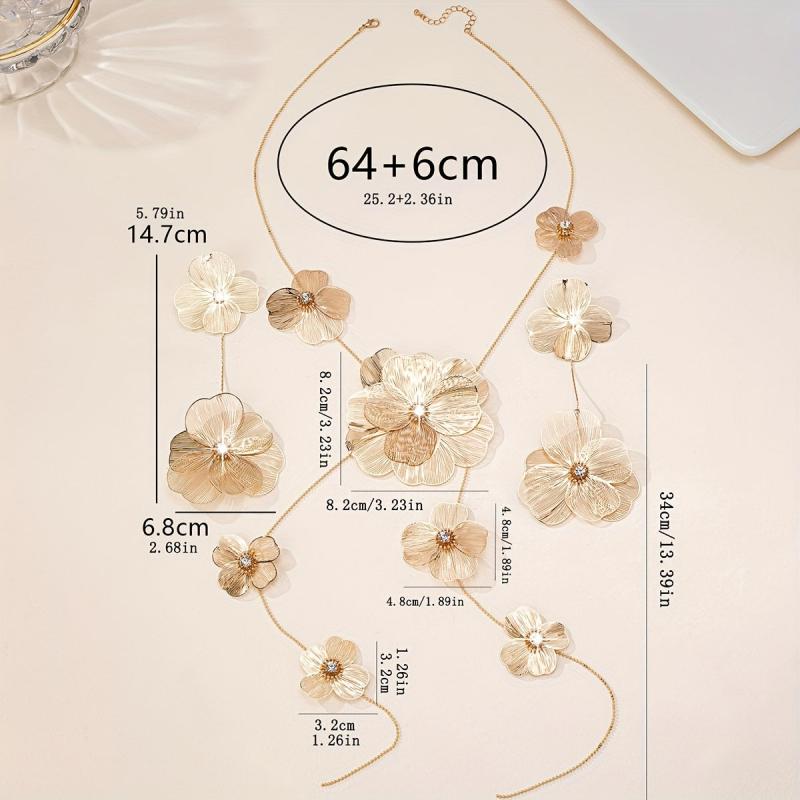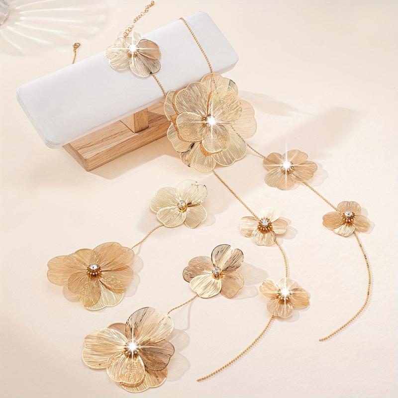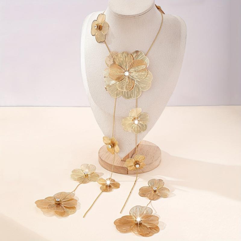 Make a stunning statement with this 18K gold-plated copper jewelry set featuring a rhinestone embellished floral hollow out design. Perfect for weddings and special occasions.