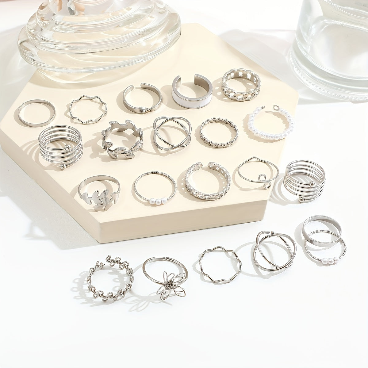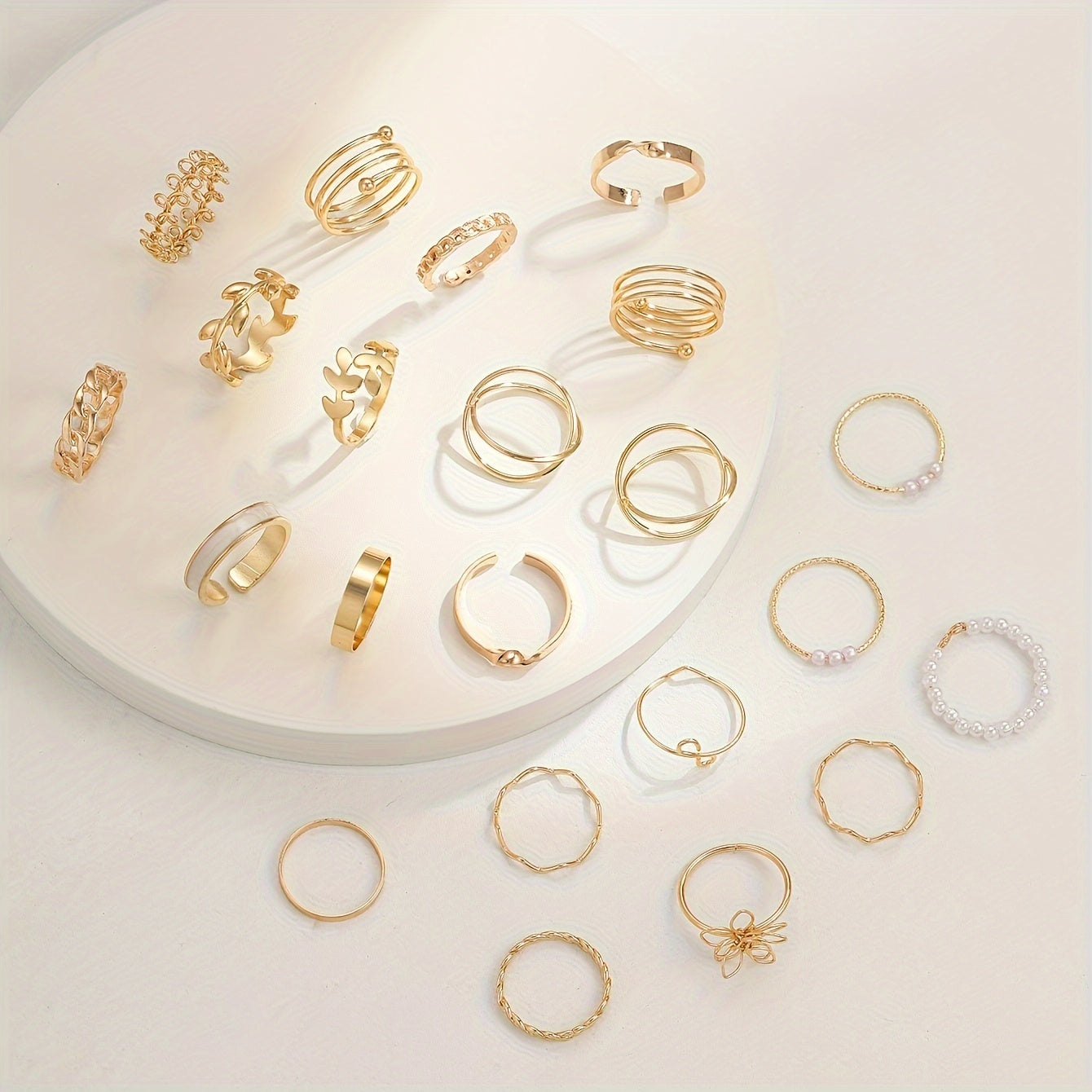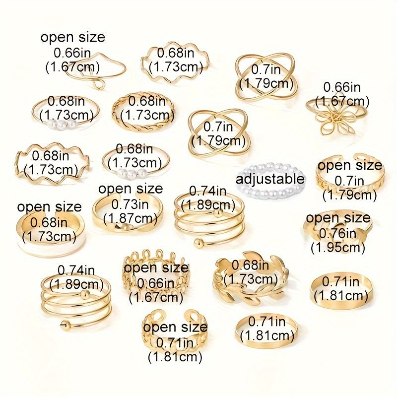 Add a touch of elegance to your outfit with this 21-piece ring set featuring golden toned rings with intricate geometric, floral, and olive motifs. Made of high-quality zinc alloy, these rings are perfect for everyday wear or special occasions.