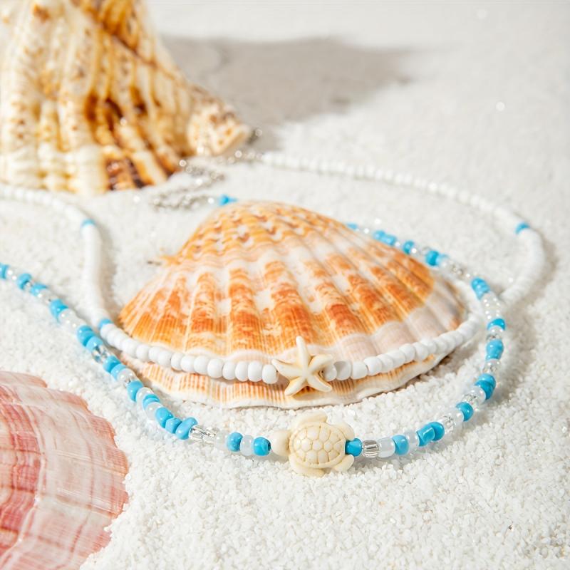 Enhance your beach casual look with this bohemian style beaded necklace set. Features turtle and starfish pendants for an ocean-inspired vibe. Perfect for vacation or parties.