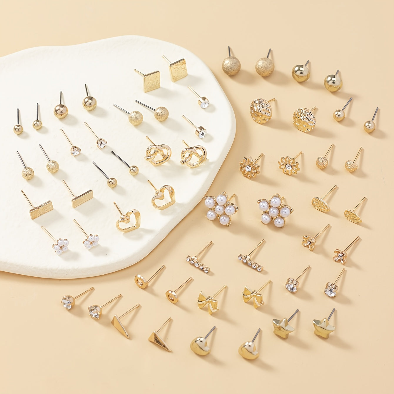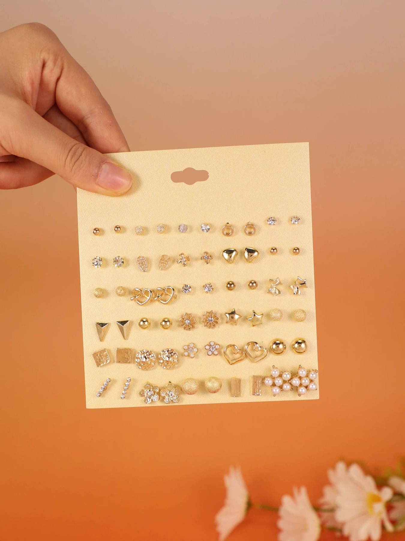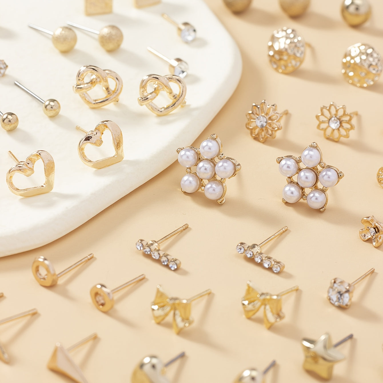 This set includes heart-shaped, flower, bowknot, matte, faux geometric, and metal earrings for daily wear.