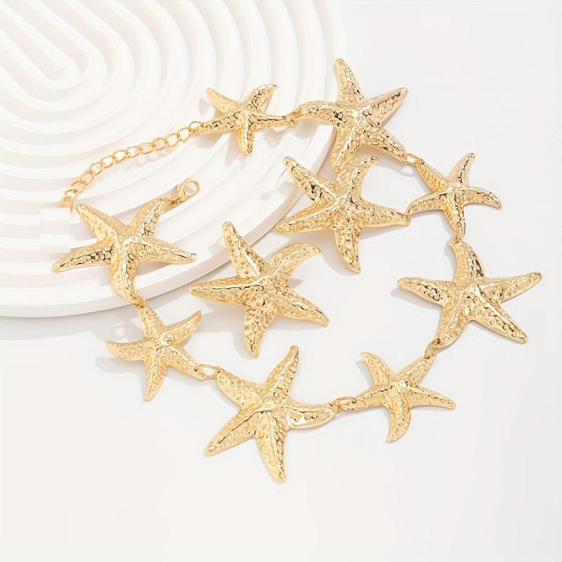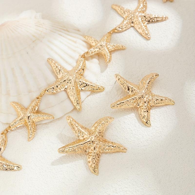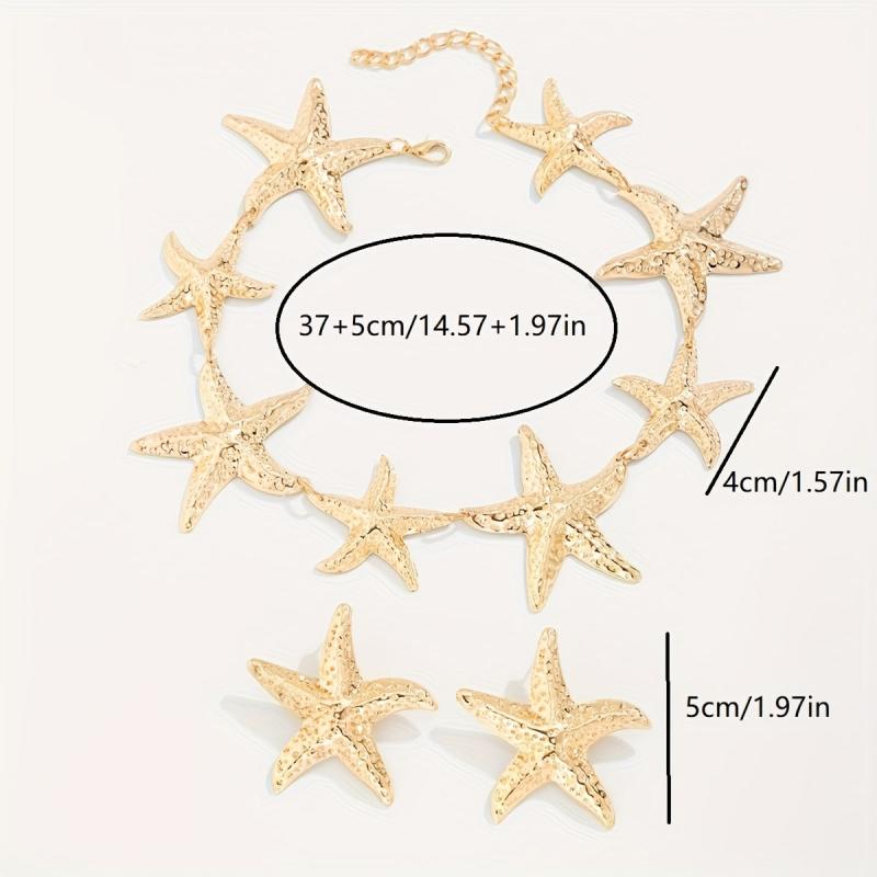 Add a touch of style with this metallic geometric starfish necklace and earrings set, perfect for beach holidays. The set includes three pieces that will elevate your look and make you stand out.