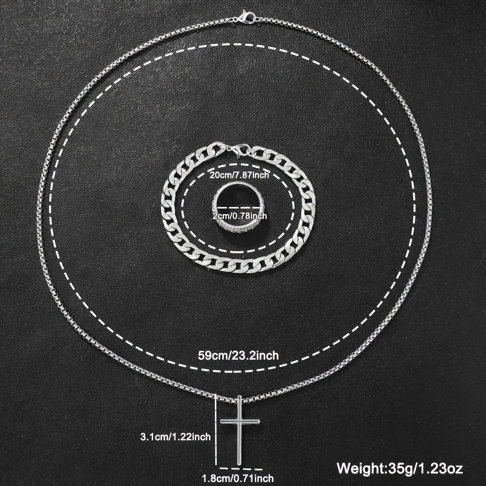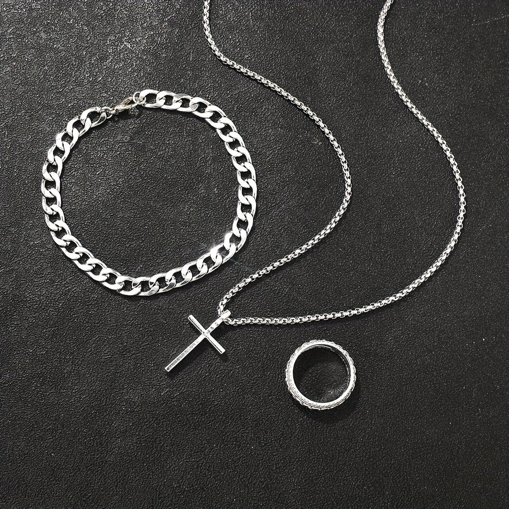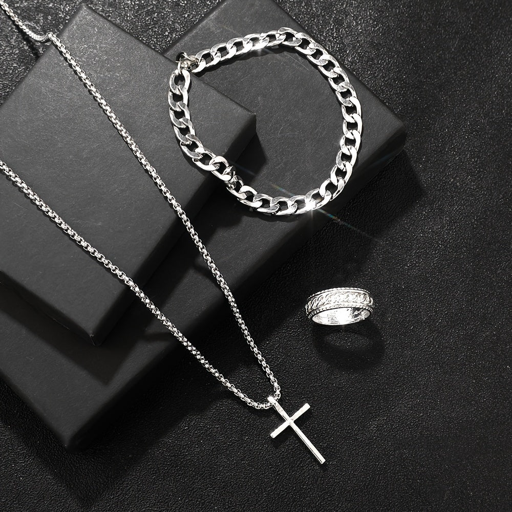 Surprise him with this stylish cross necklace, ring, and bracelet set. Perfect for adding a hip hop touch to his look. Ideal gift for Christmas.