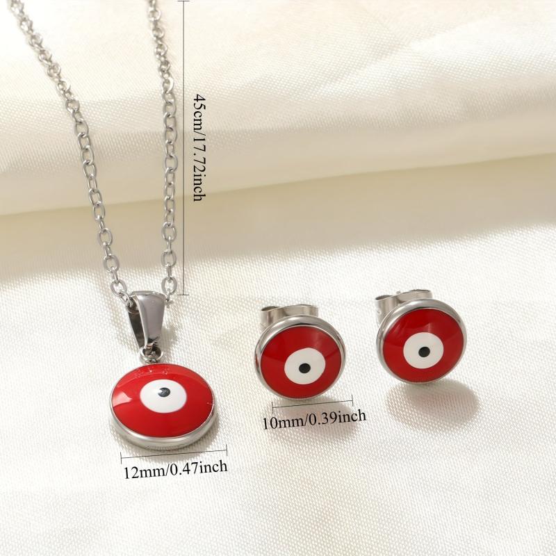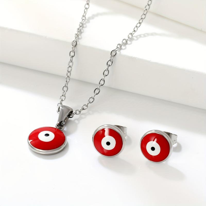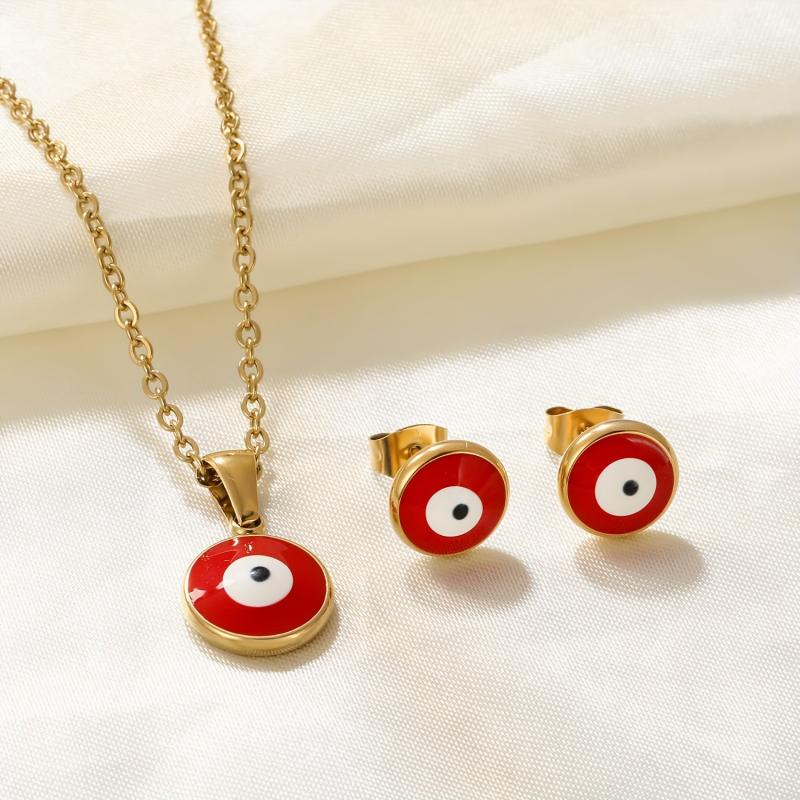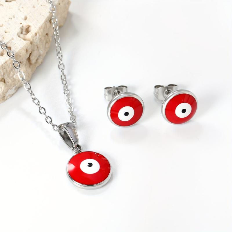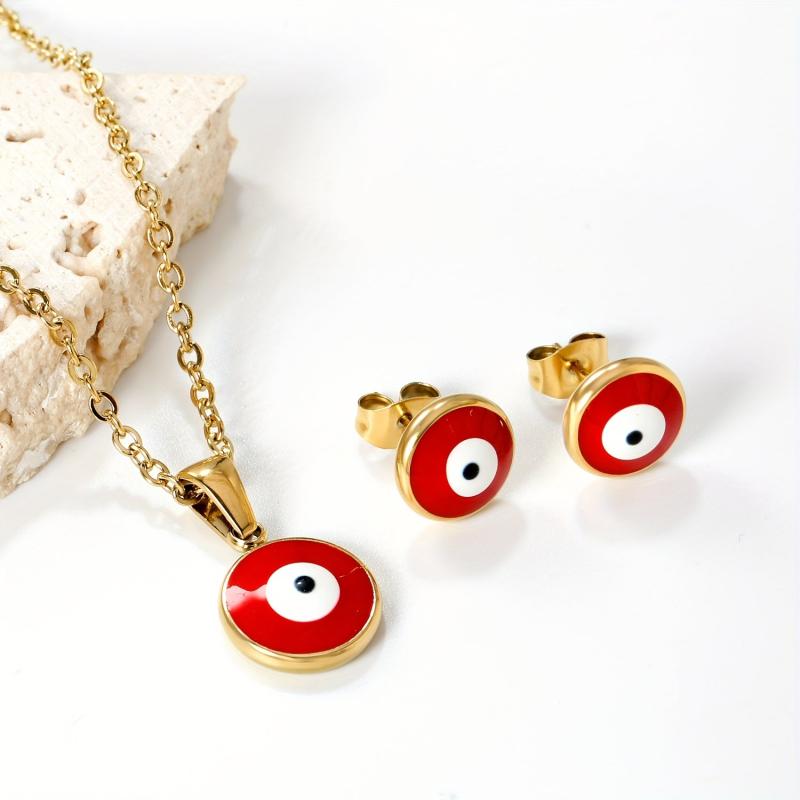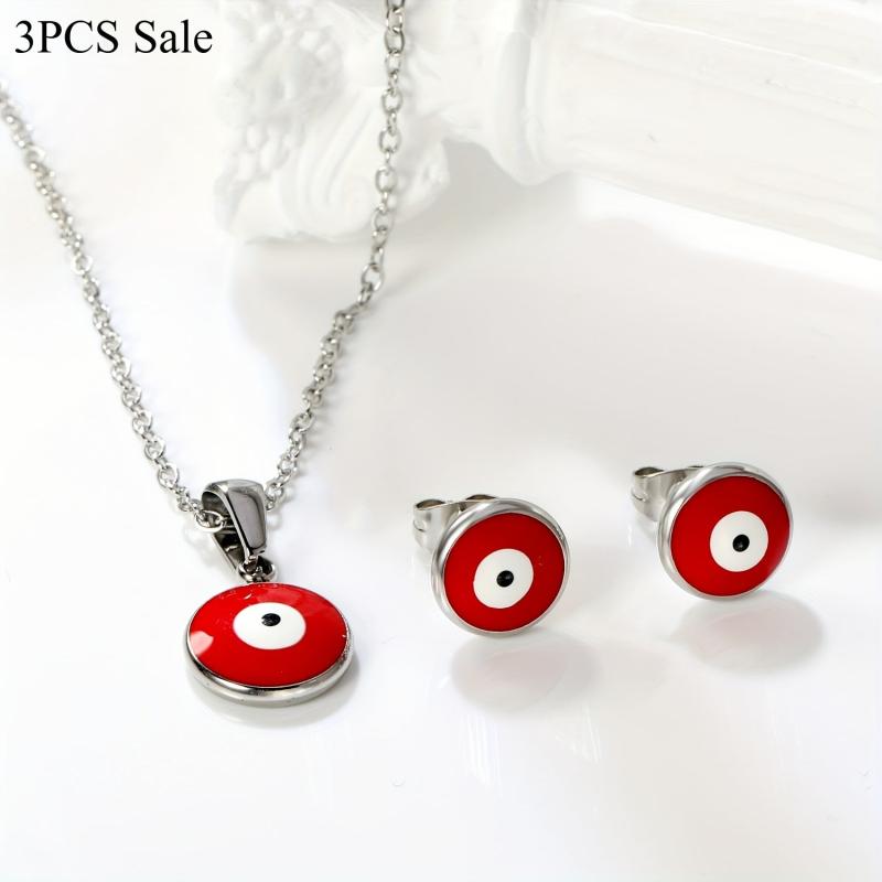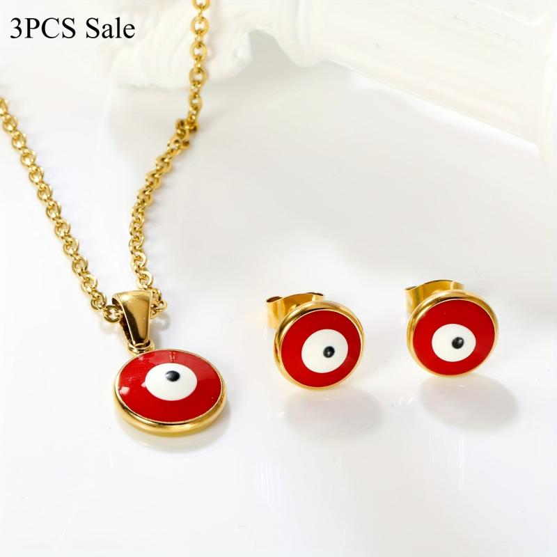 Enhance your style with this 3pcs stainless steel pendant necklace and earrings set featuring 18K golden plating. The eye-catching red eye design adds a touch of edginess to your look.
