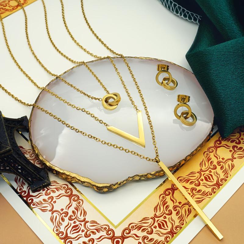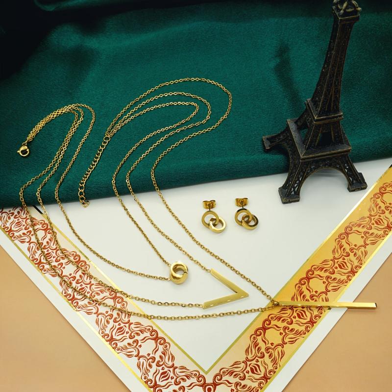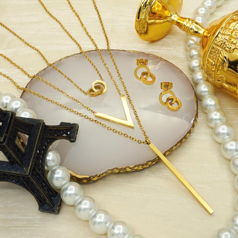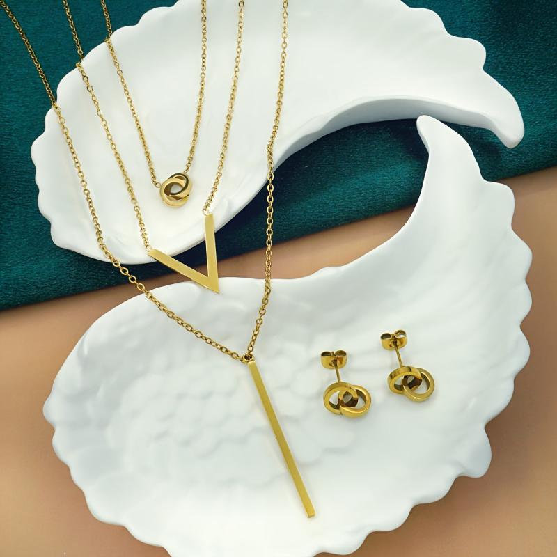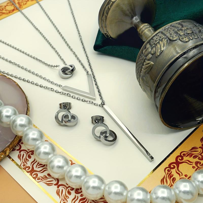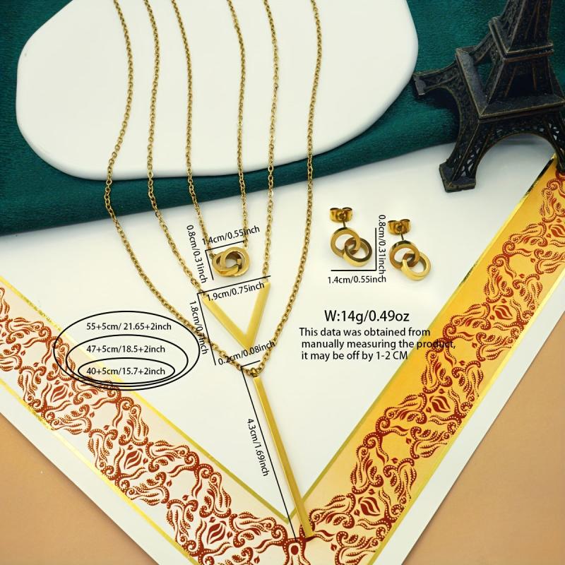 3pcs Women's Stainless Steel V Geometric Double Circle Necklace and Earrings Set