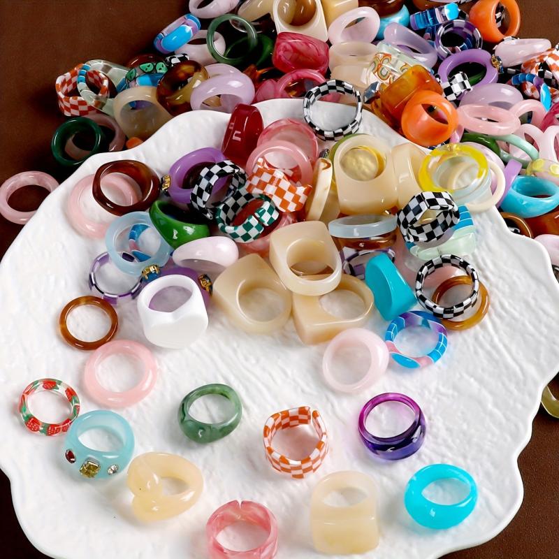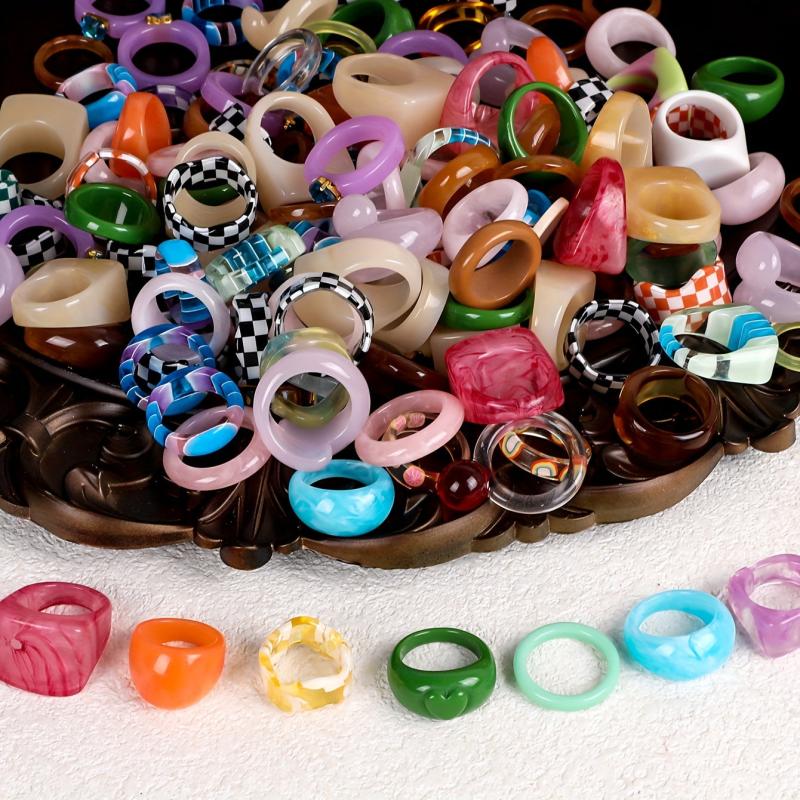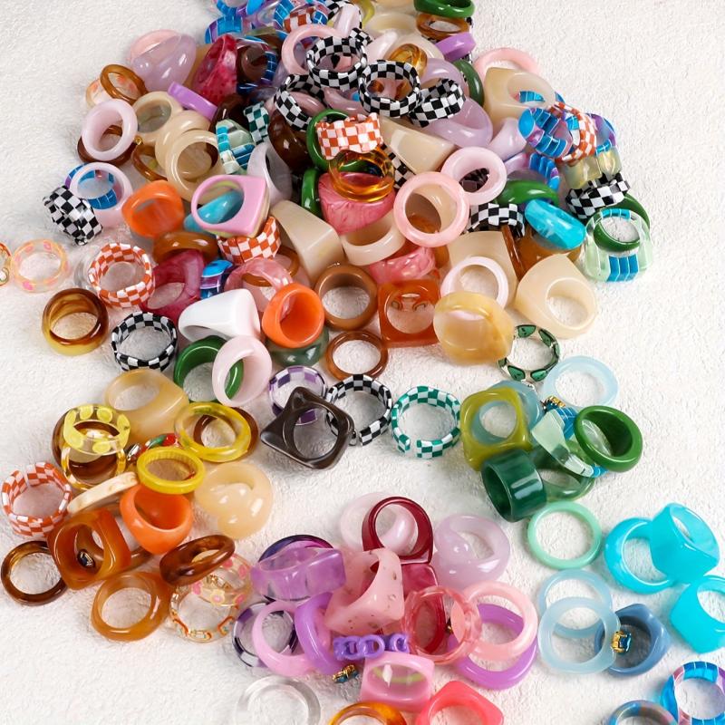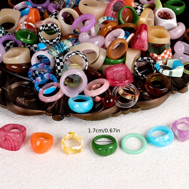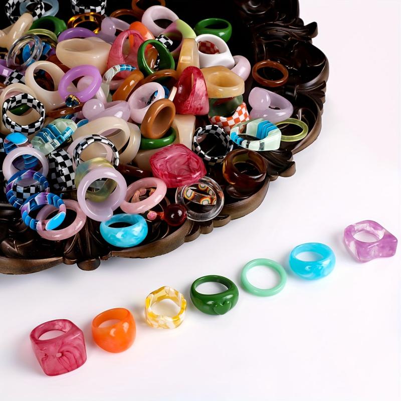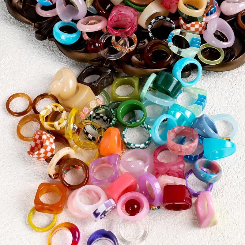 Elevate your accessory game with this set of 50 acrylic rings featuring a mix of transparent and solid resin bands. Perfect for daily wear or vacation outfits.
