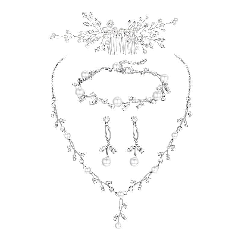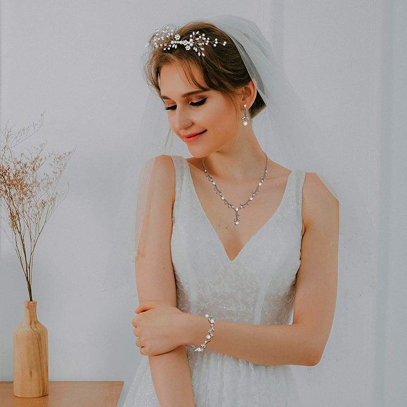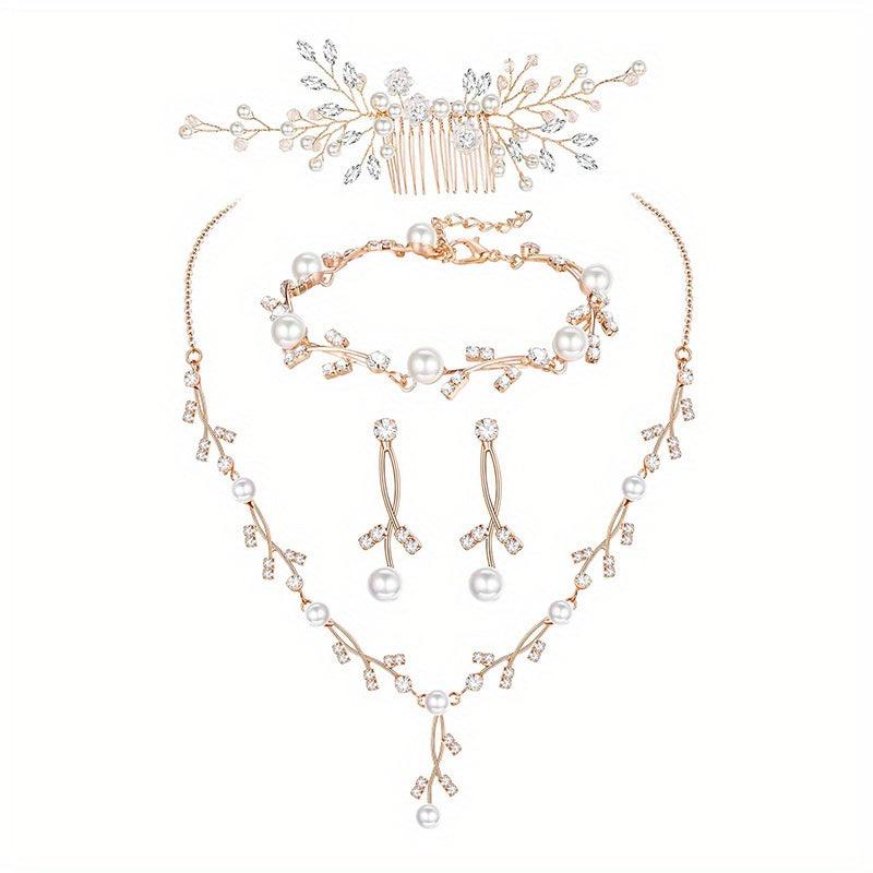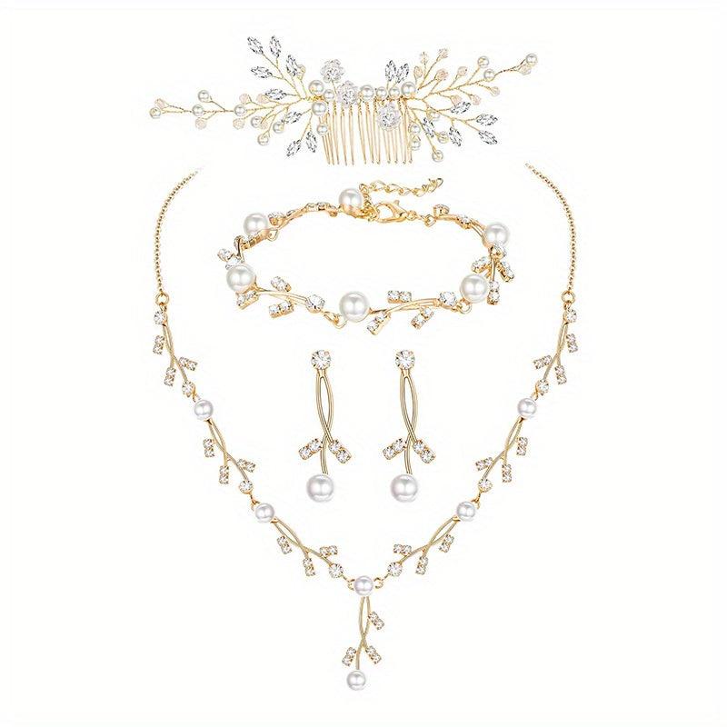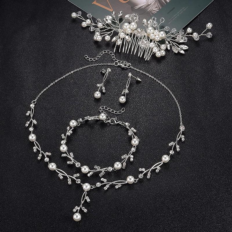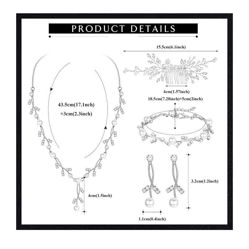 This elegant prom jewelry set includes a synthetic pearl drop necklace, earrings, bracelet, and hair pins adorned with synthetic rhinestones and crystals.