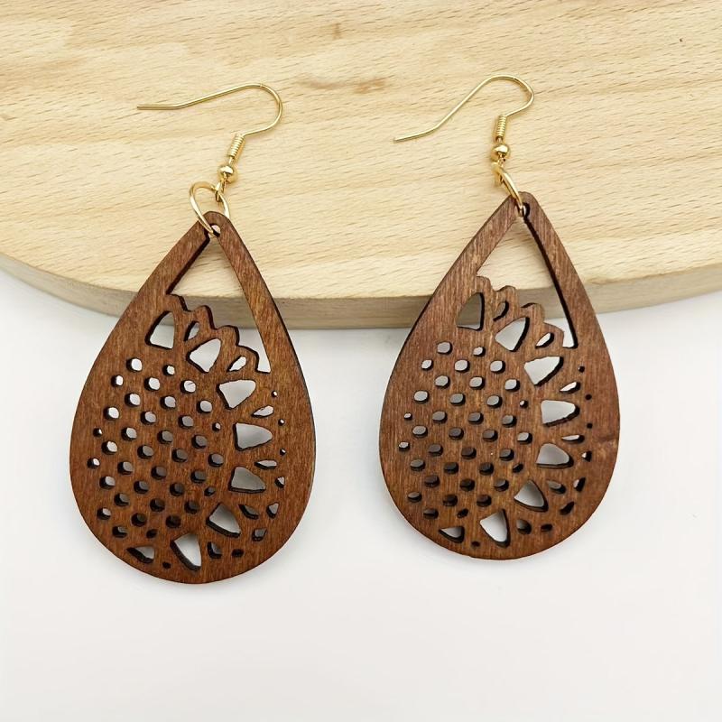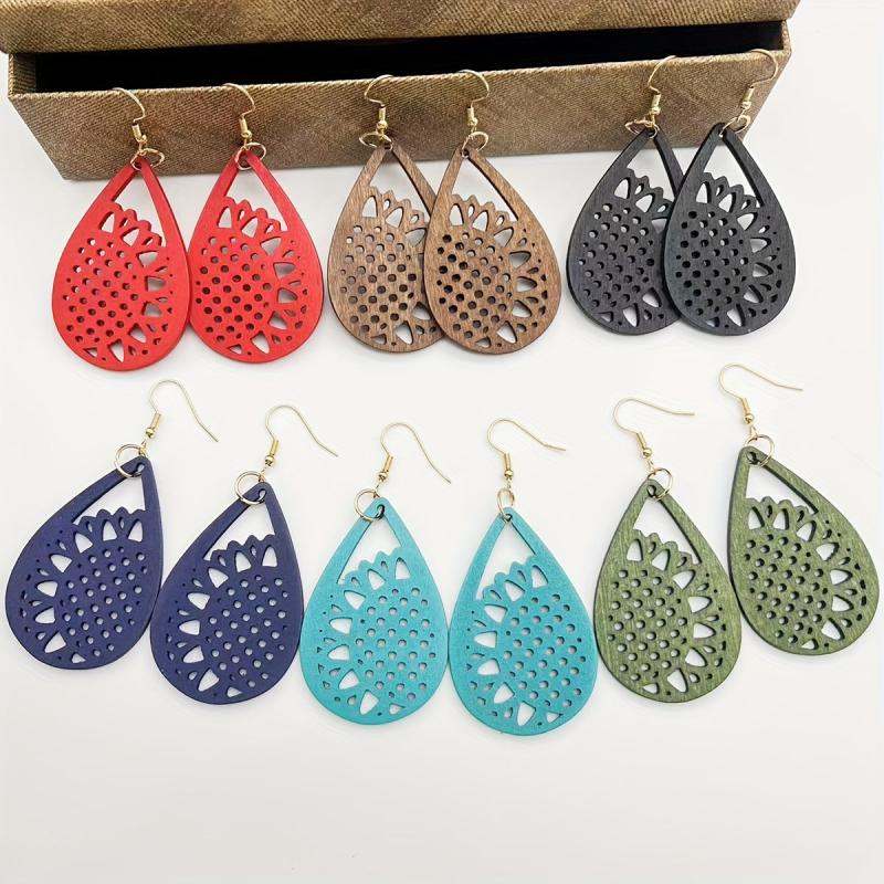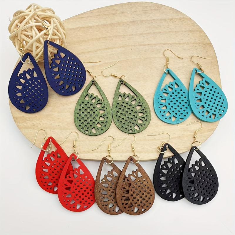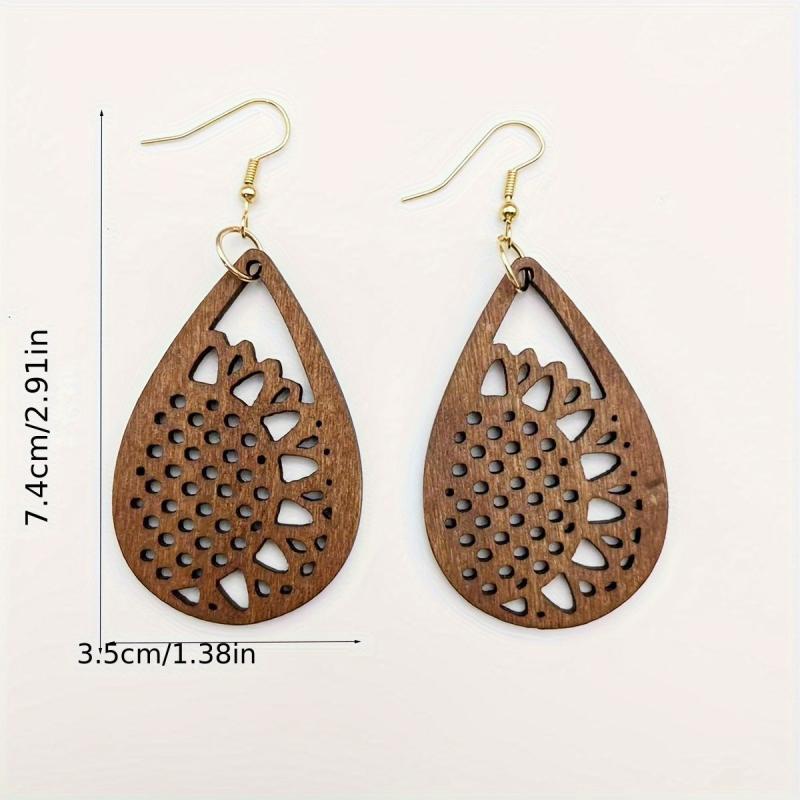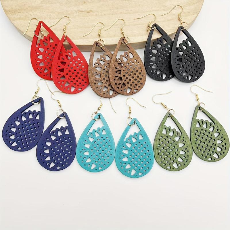 Adorn yourself with this charming set of earrings featuring wooden sun flower and water drop hollow flower pendants in 6 different colors.