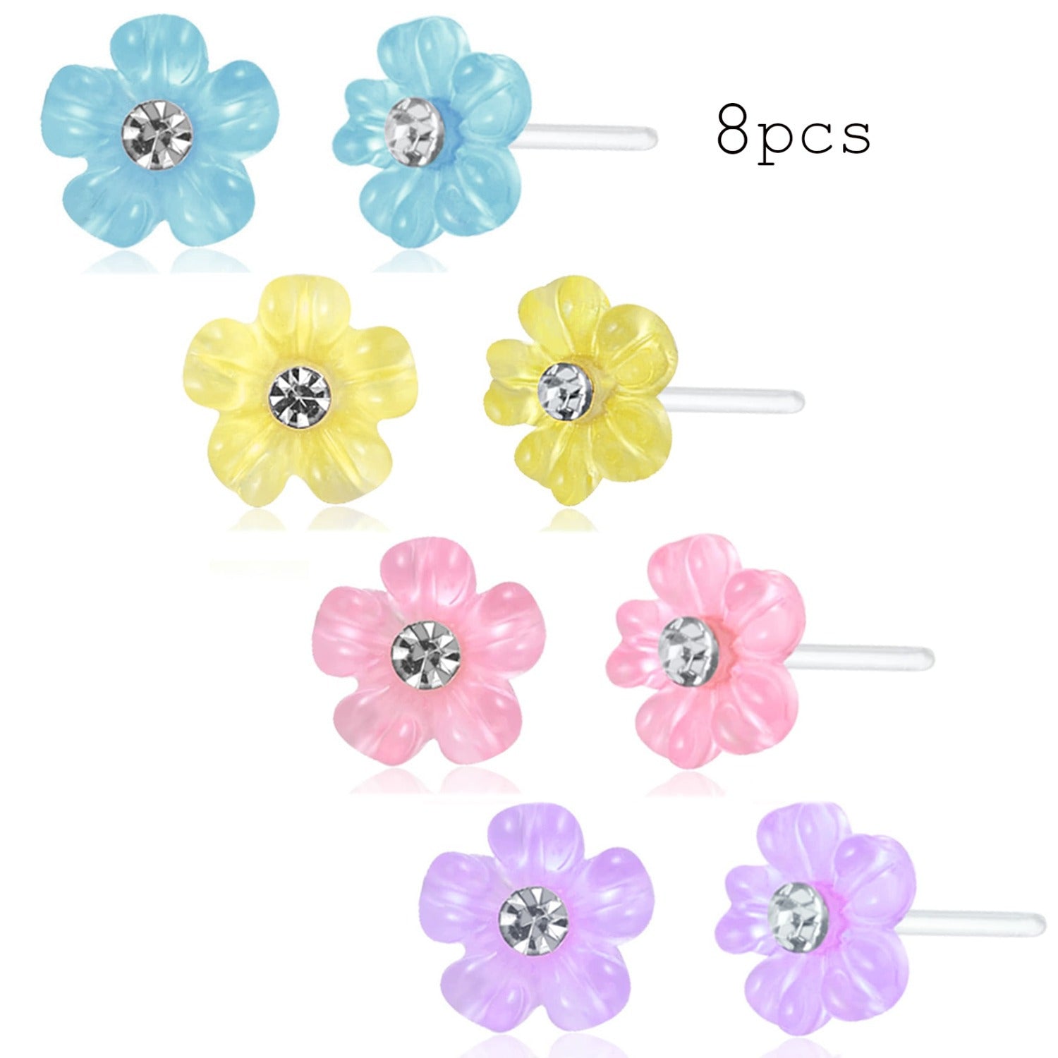 Beautiful set of 8 floral resin earrings in pink, yellow, purple, and light pink colors. Perfect for daily wear or special occasions like weddings. Features hypoallergenic plastic posts for sensitive ears.