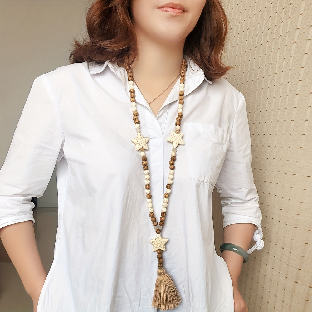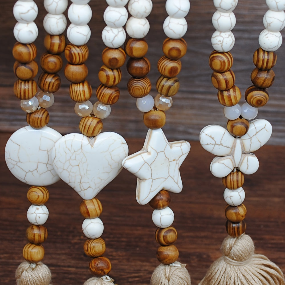 Elevate your boho style with this retro synthetic turquoise long necklace featuring ethnic heart, butterfly, star, and tassel pendants. Perfect to add a touch of uniqueness to your outfit.