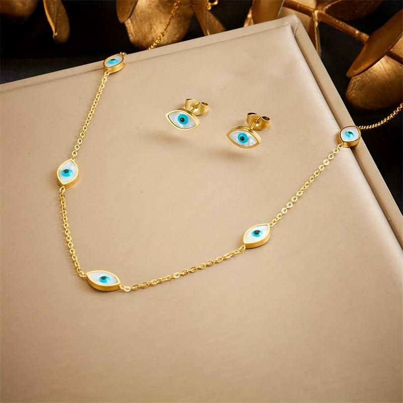 Make a statement with this Bohemian retro minimalist eye necklace and earring set featuring golden stainless steel.