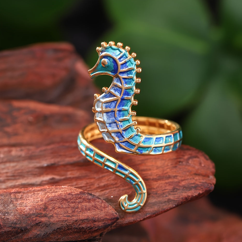 Elevate your style with this boho vacation inspired seahorse ring crafted in enamel stainless steel. It is perfect for daily wear and parties, adding a touch of versatility to your jewelry collection.