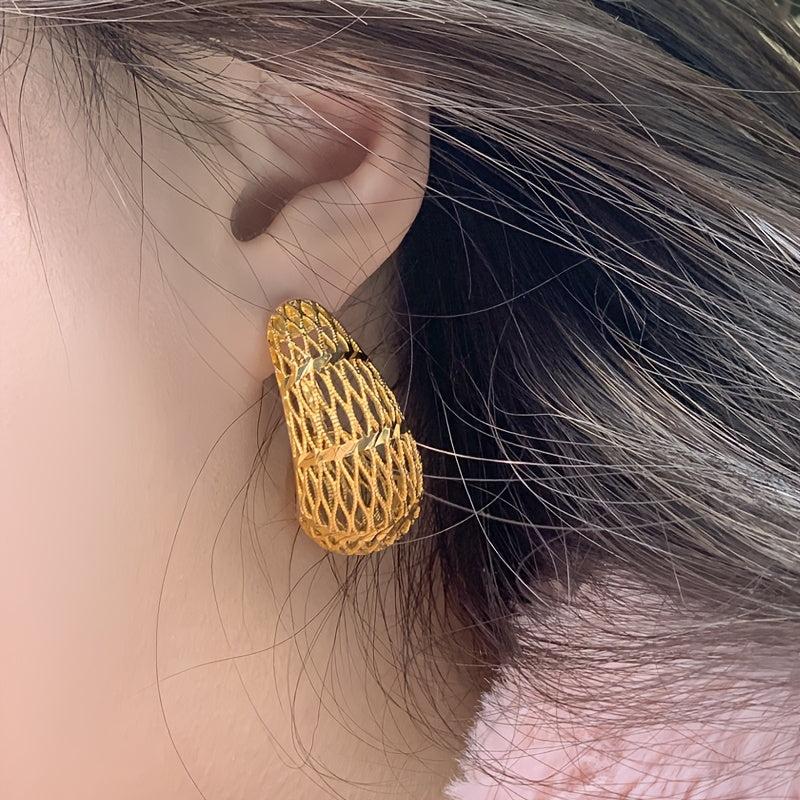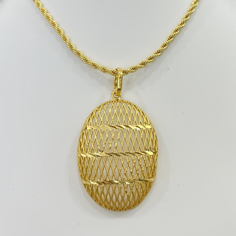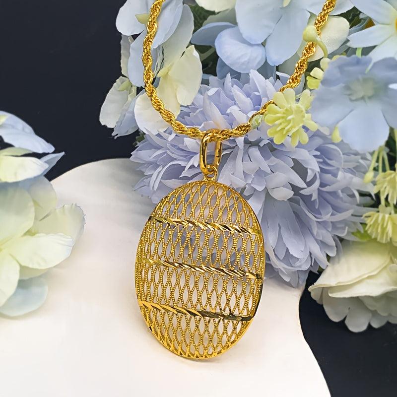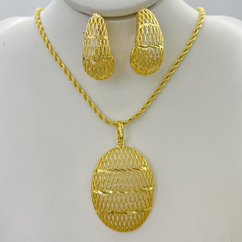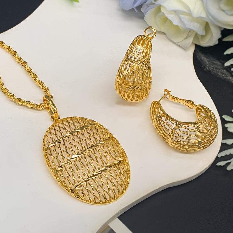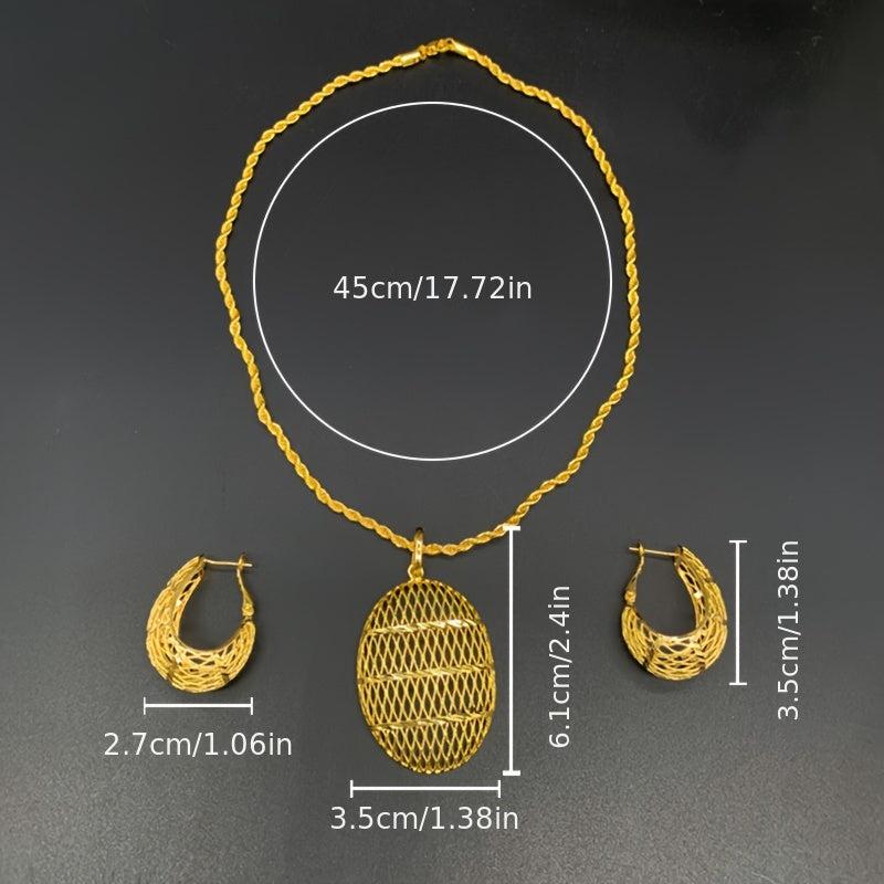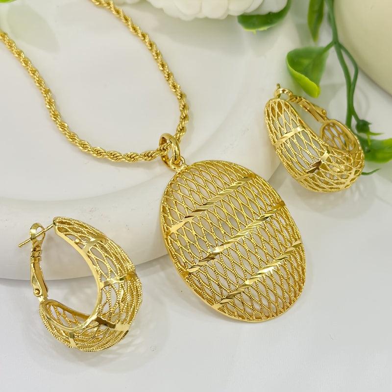 Elevate your look with this bohemian inspired jewelry set featuring a hollow oval pendant necklace and matching earrings.