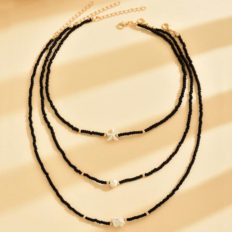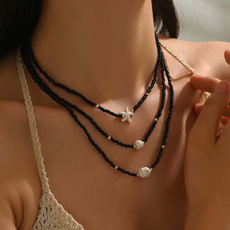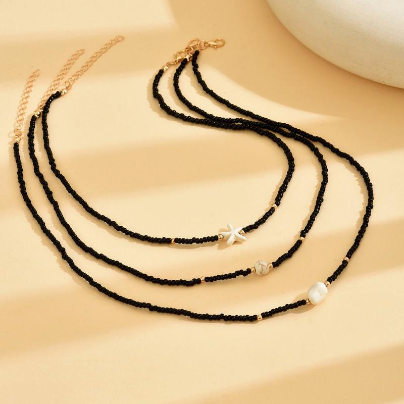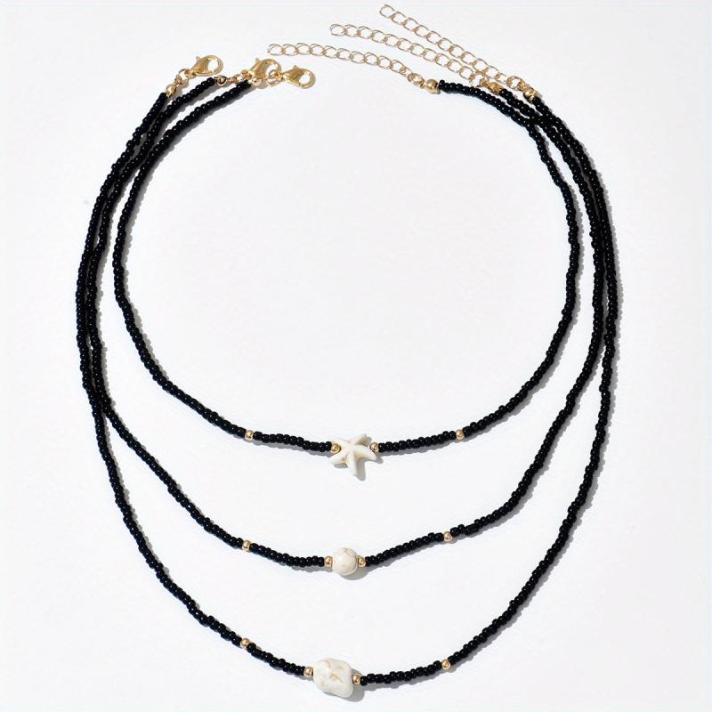 Complete your beach vacation look with this bohemian style choker necklace set featuring synthetic turquoise starfish inlaid beads and hand-woven round beads.