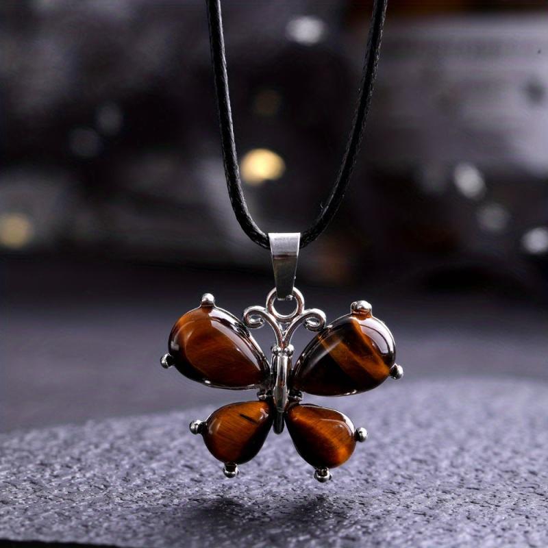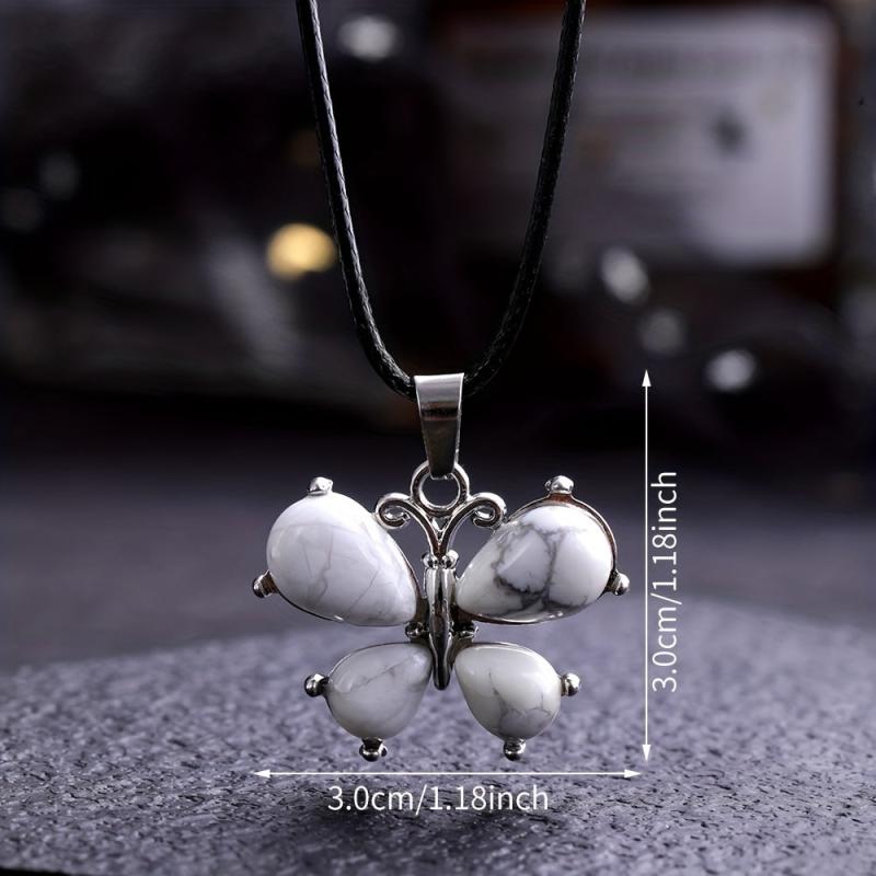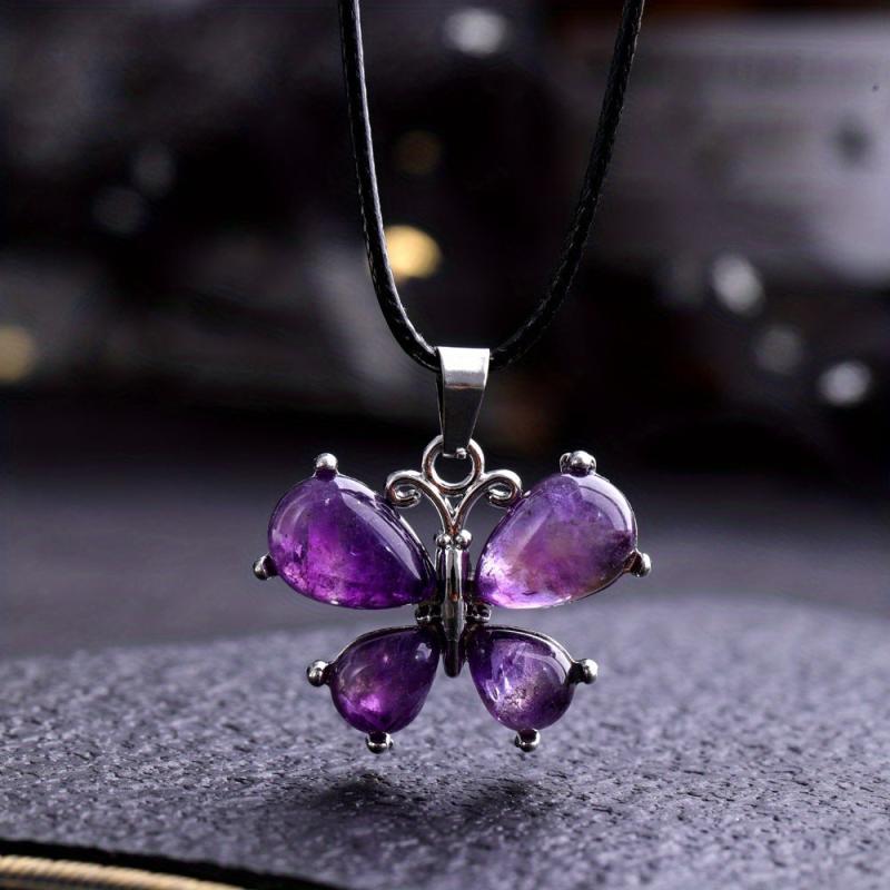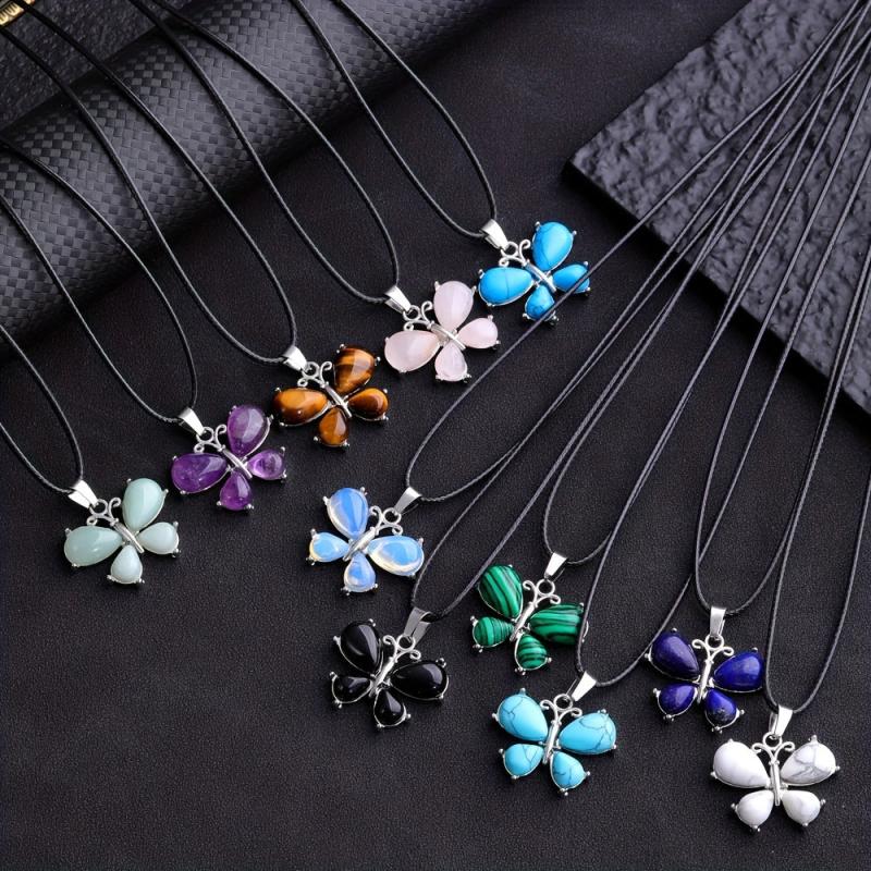 This beautiful pendant necklace features a butterfly design with natural stones including rose quartz, amethyst, opal, and crystal. Perfect for adding a touch of elegance to any outfit.