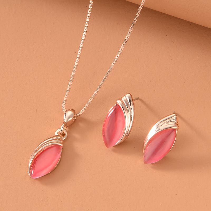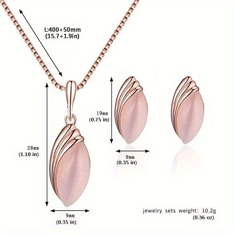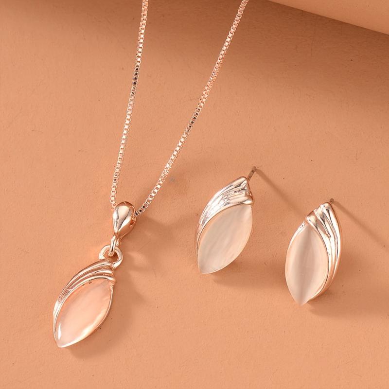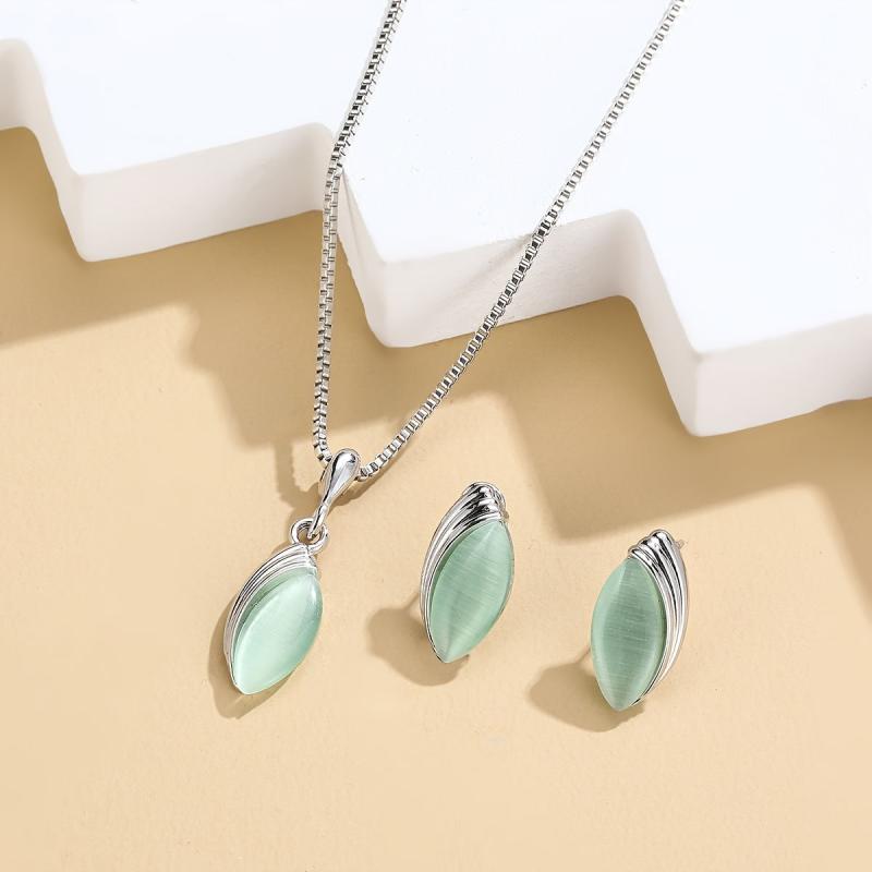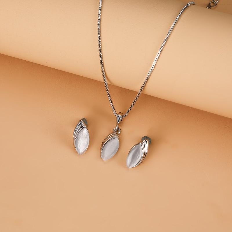 Stylish oval cat's eye stone necklace and teardrop pendant earrings set for men and women. This minimalist accessory gift set is perfect for any occasion.
