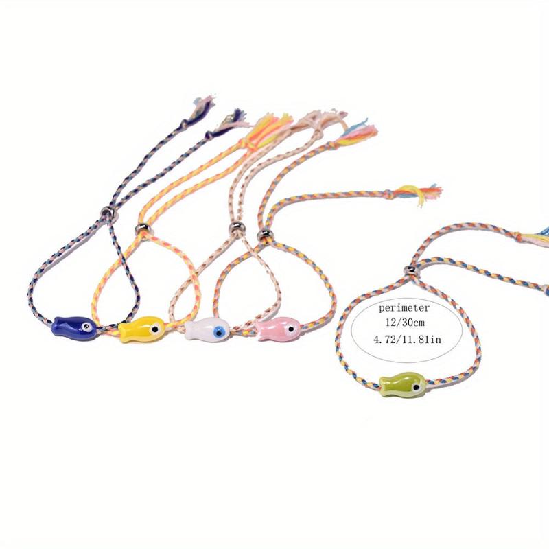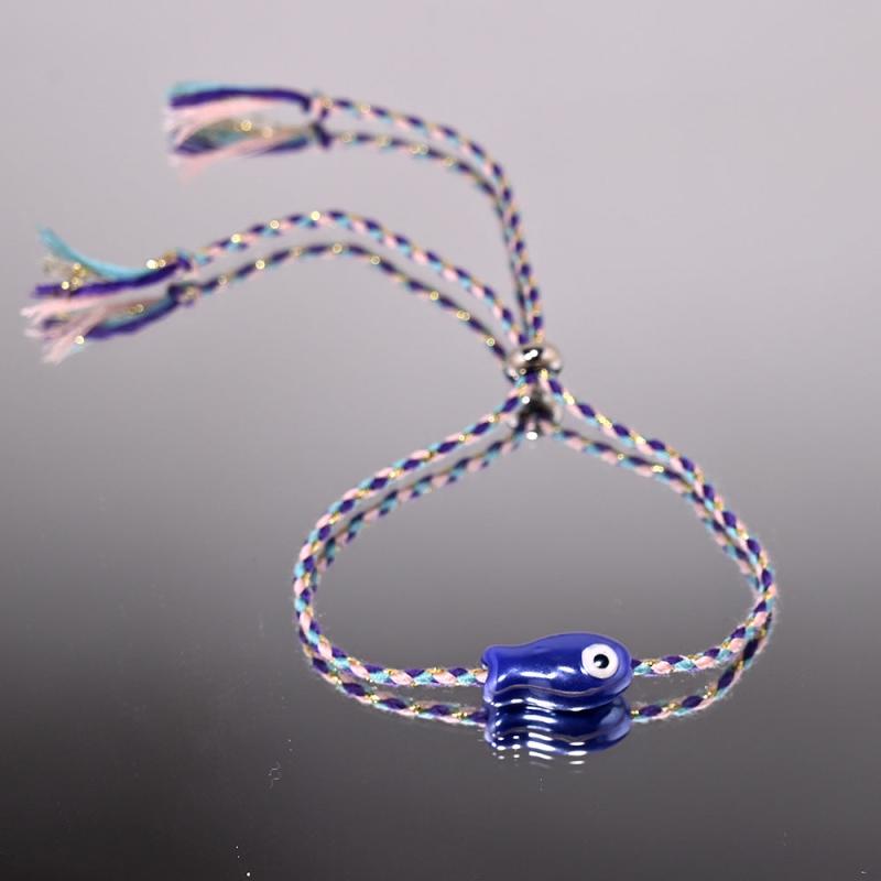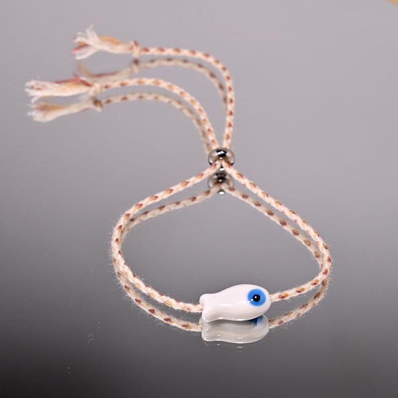 This adorable bracelet features a ceramic fish charm on a handwoven cord with Tibetan braiding. Perfect for adding a colorful bohemian touch to your outfit.