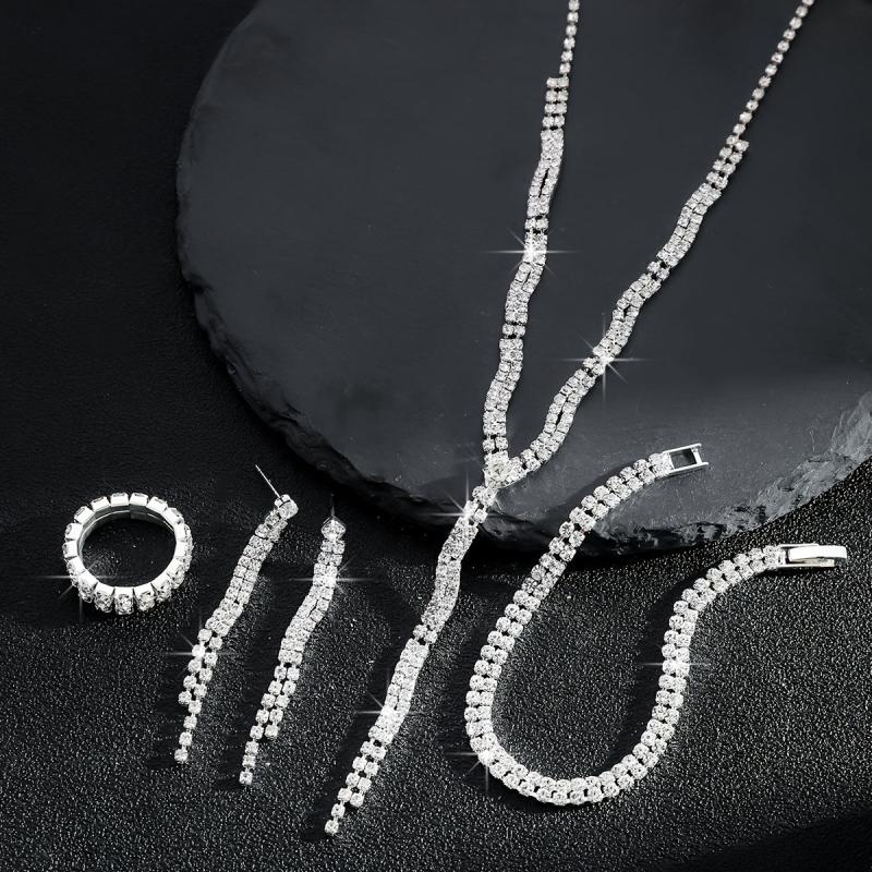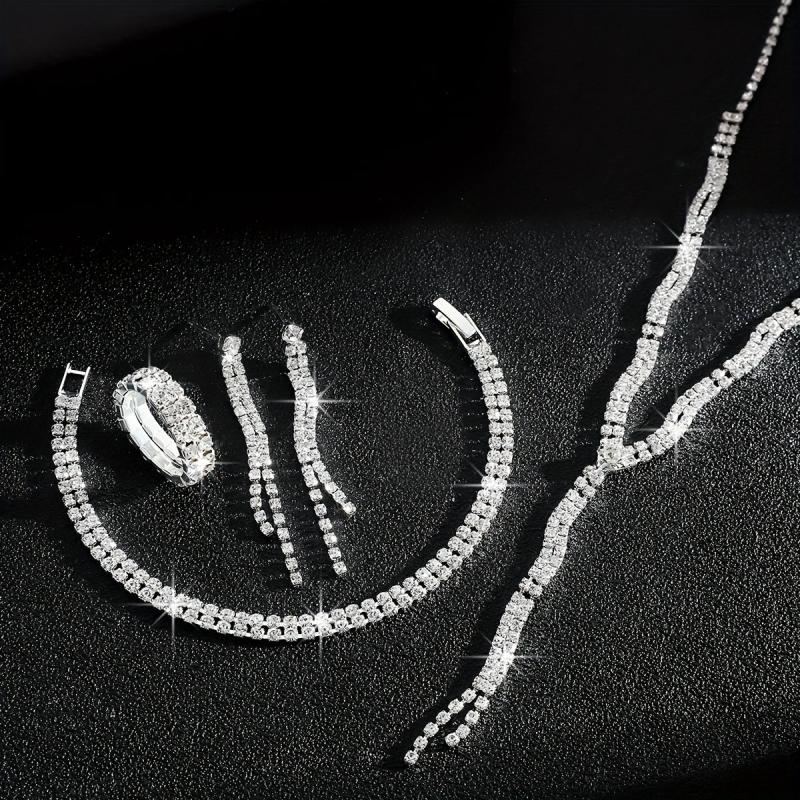 This stunning copper jewelry set features a Y shape necklace, bracelet, earrings, and ring, adorned with rhinestones. Perfect for parties and formal events, this set is a versatile accessory that can elevate any outfit.