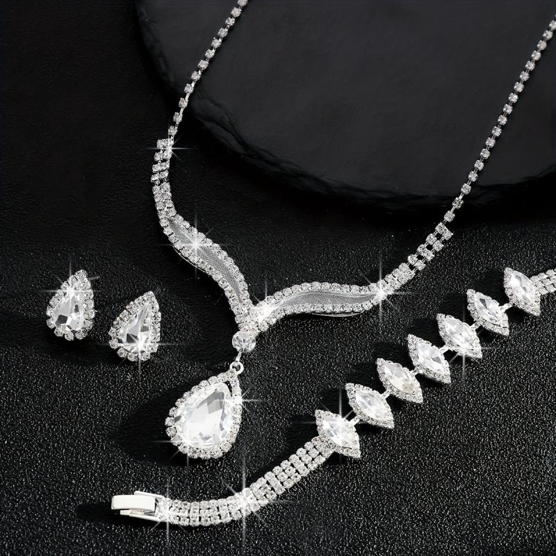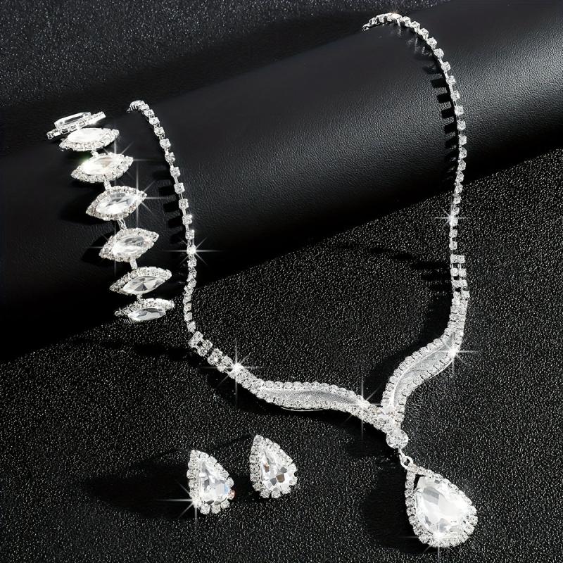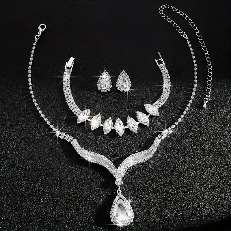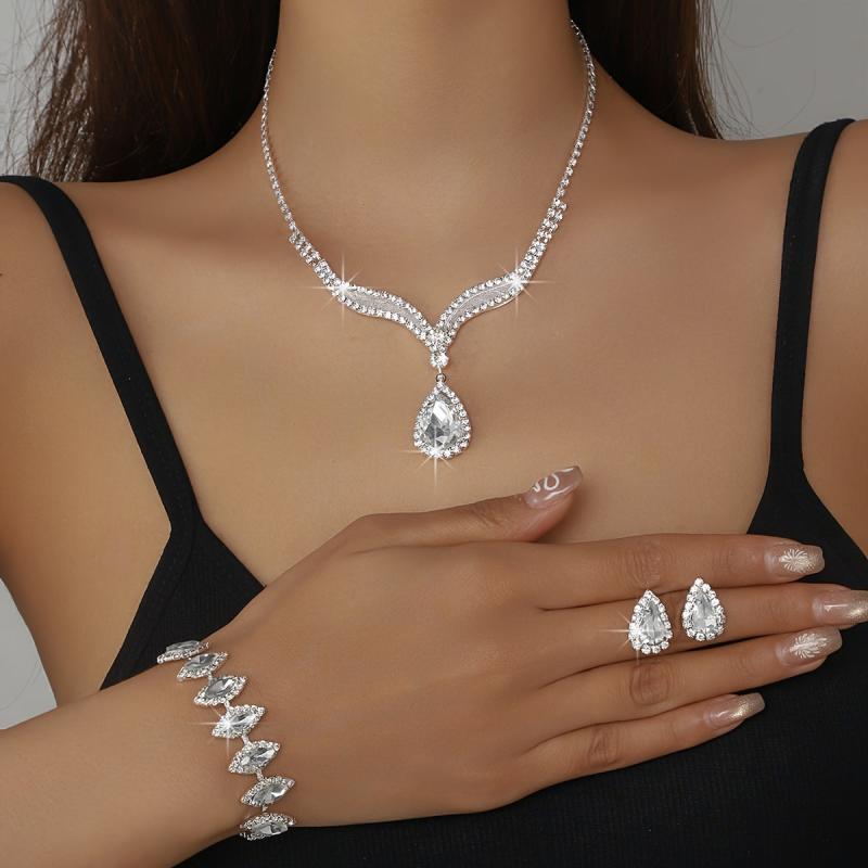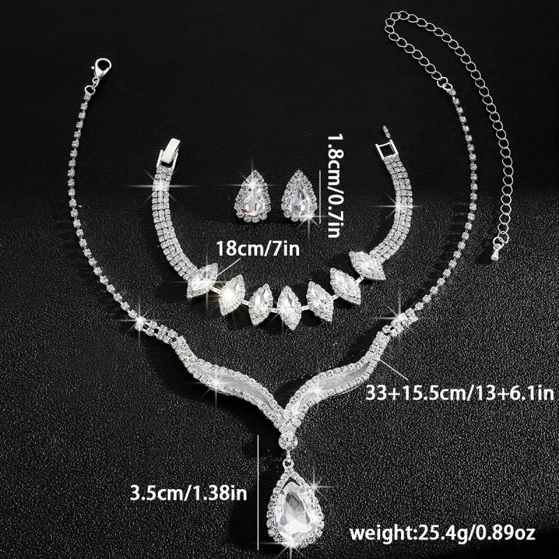 This elegant three-piece set includes a necklace, bracelet, and earrings made of artificial crystal in a stunning horse eye water drop design. Perfect for adding a touch of glamour to any bridal ensemble.