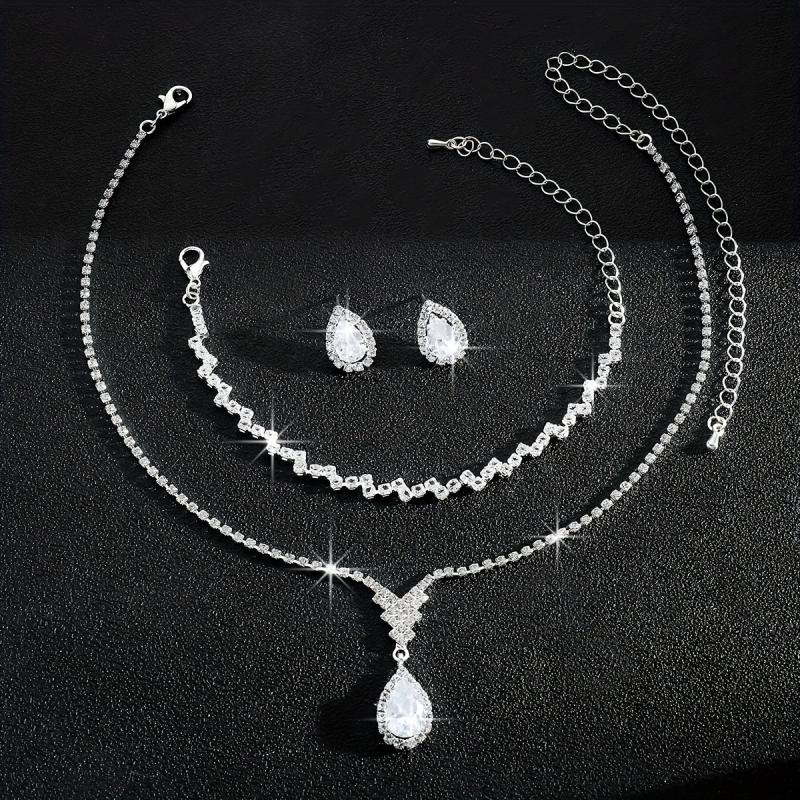 Adorn yourself with this minimalist crystal teardrop necklace, bracelet, and earrings set. Perfect for adding a touch of elegance to your party outfit.