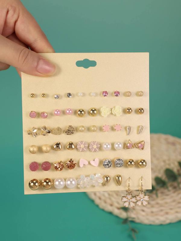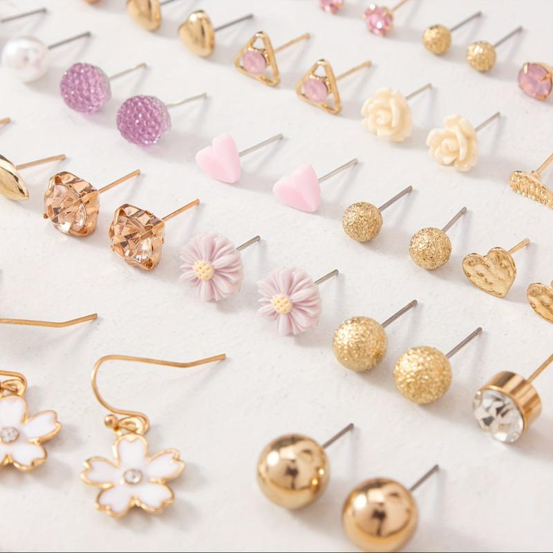 Elevate your style with this set of 30 pairs of metal resin stud earrings featuring small daisy flowers with heart-shaped leaves. Perfect for adding a touch of sparkle to your look!