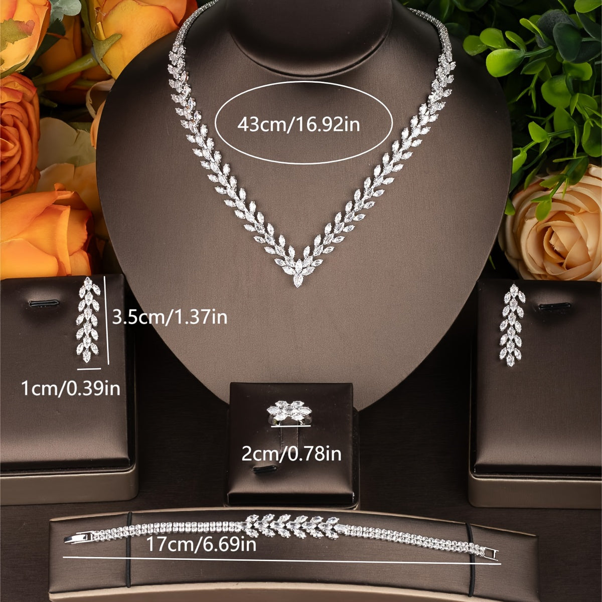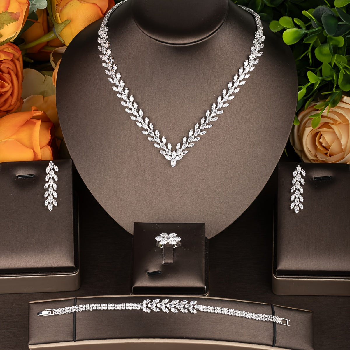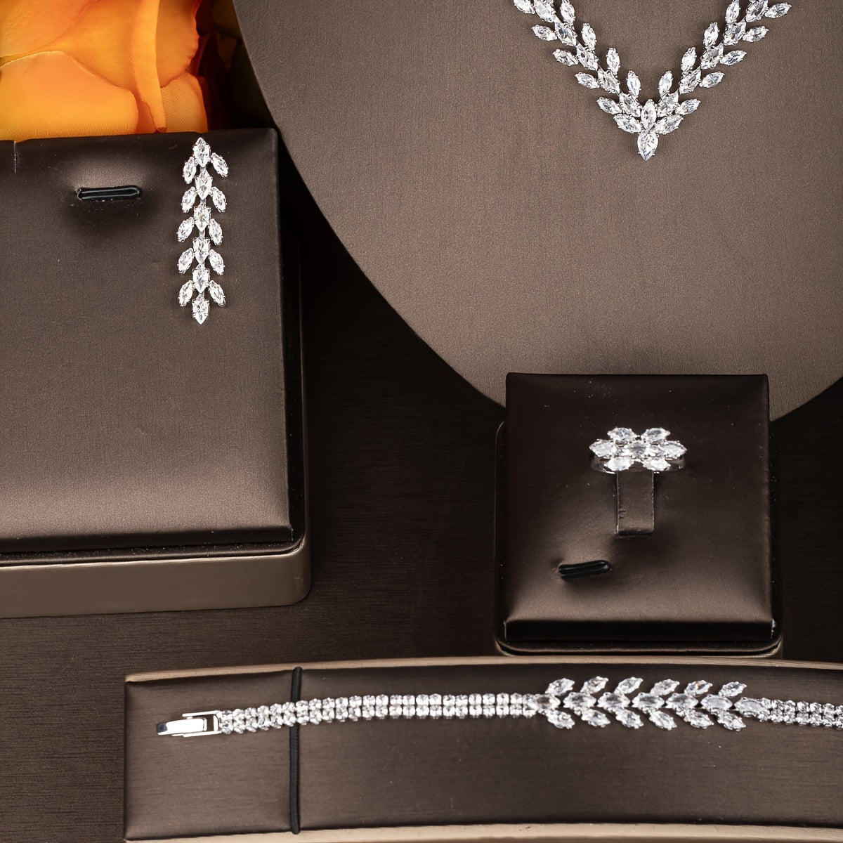 This stunning set includes a necklace, bracelet, earrings, and ring with intricate vine inlay design. Perfect for weddings and special occasions.