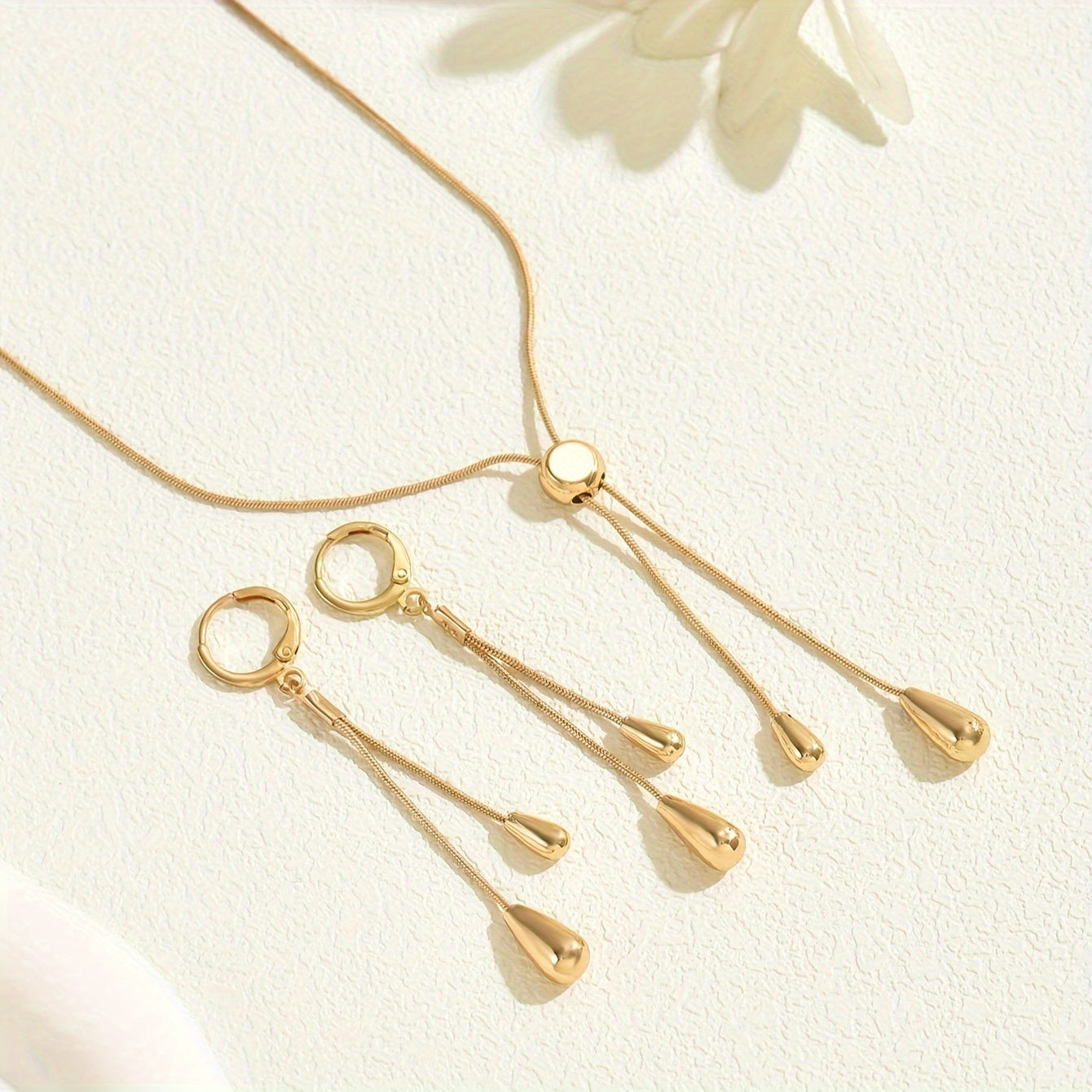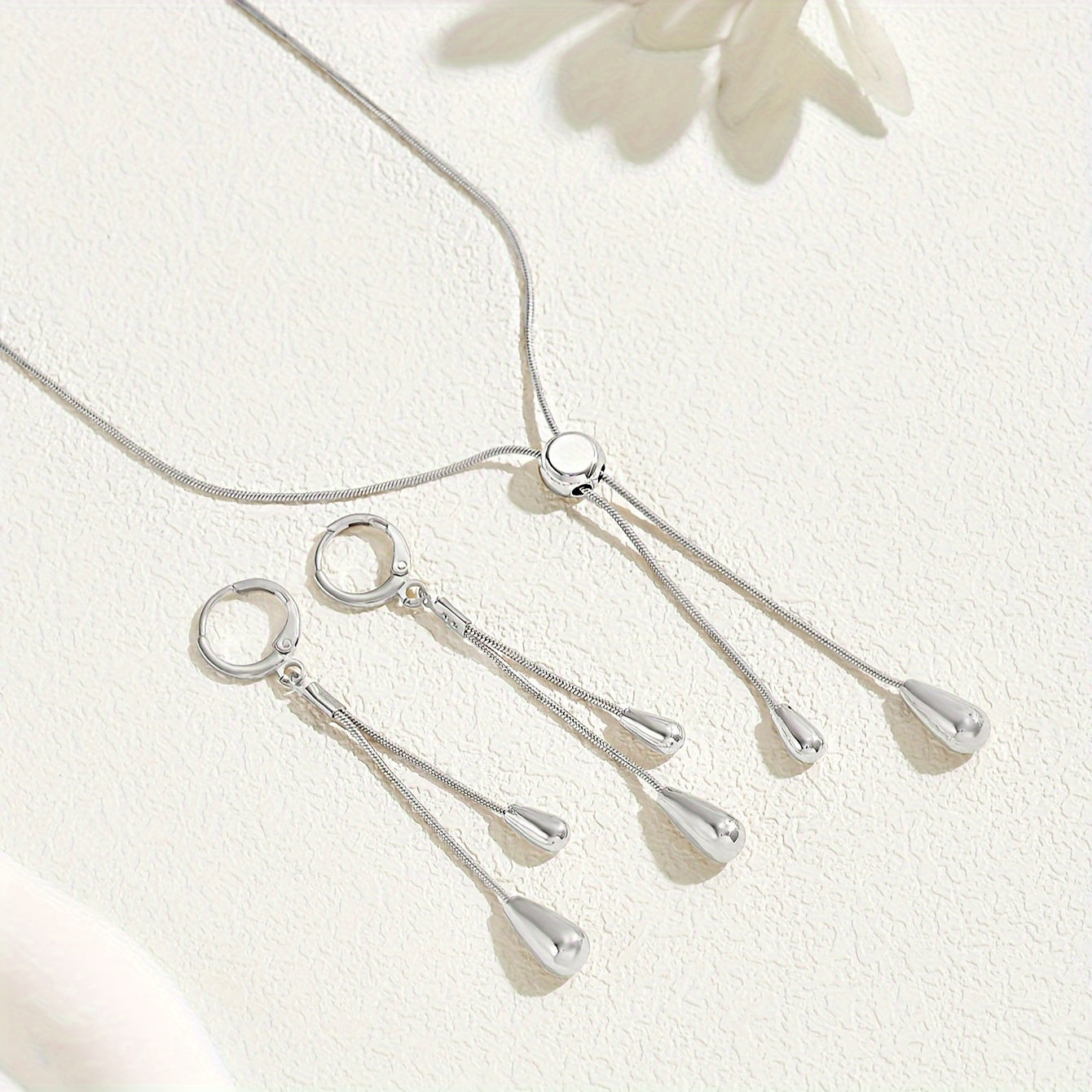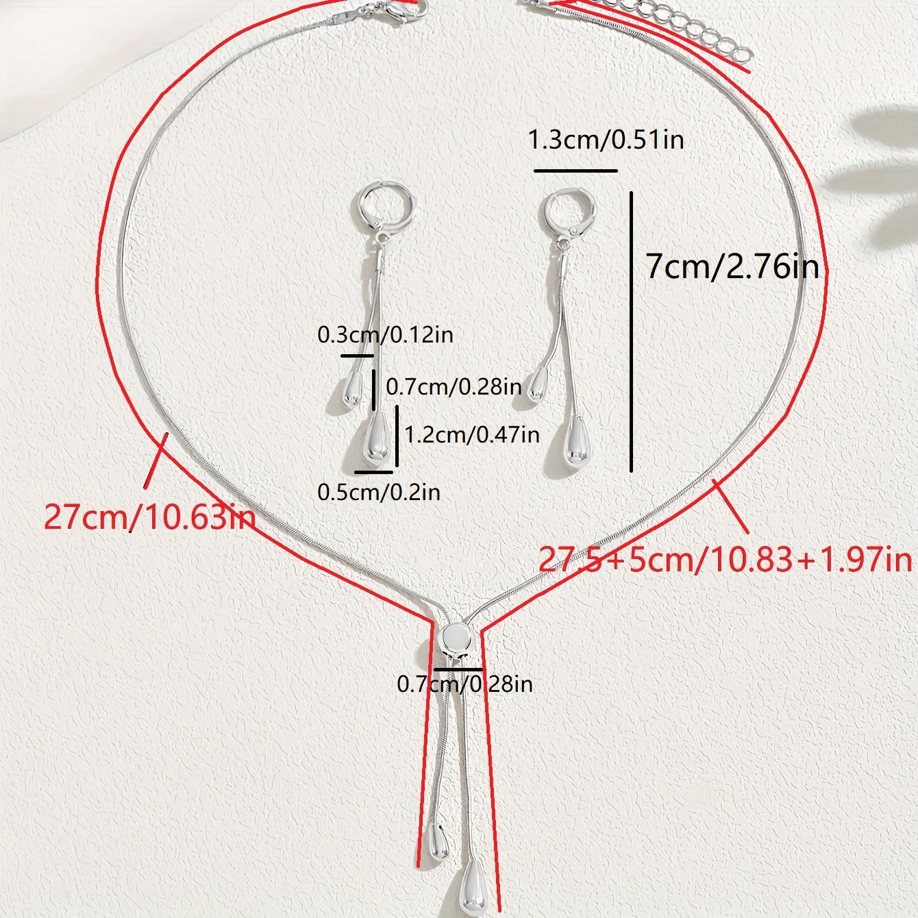 This stunning jewelry set features a sleek snake chain necklace with an adjustable water droplet pendant that exudes elegance. The matching set of water droplet earrings completes the stylish look.