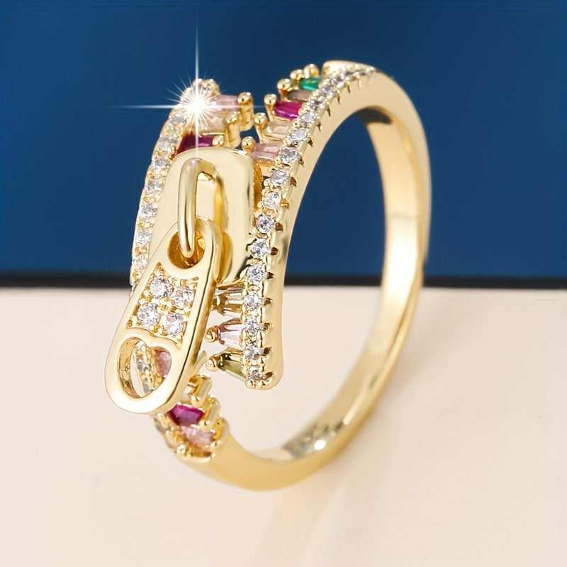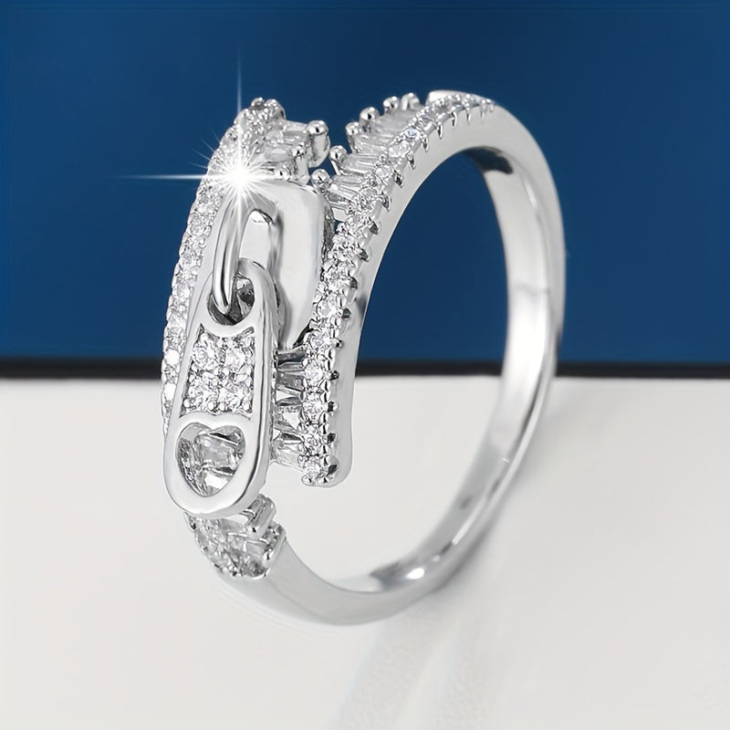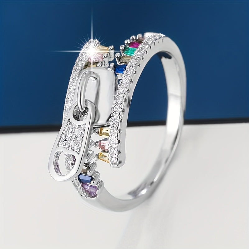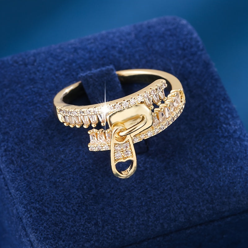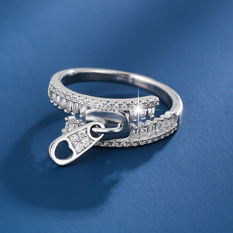 Elegant and trendy zipper ring with synthetic cubic zirconia accents. Made from copper with unique plating. Perfect for daily wear and gifting occasions.