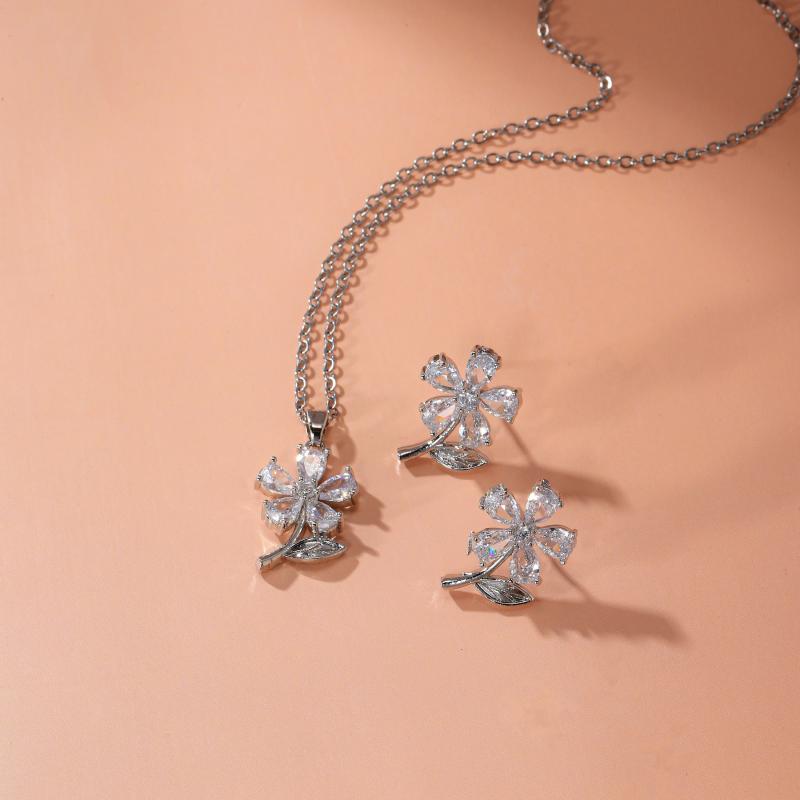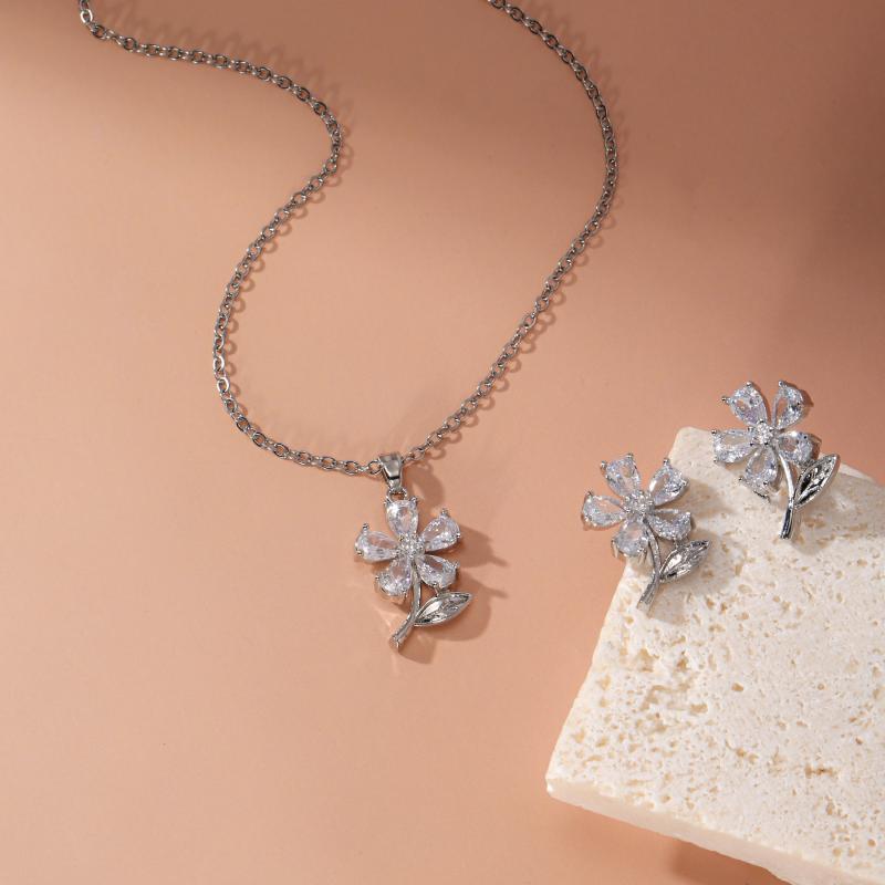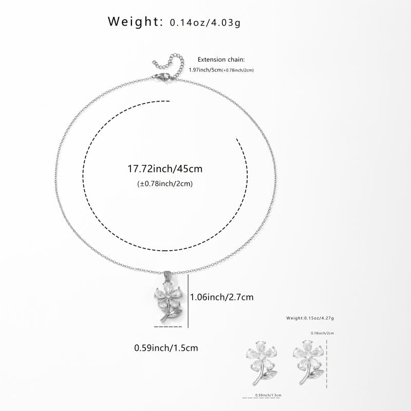 Make a statement with this beautiful flower necklace and earrings set. Crafted from stainless steel, this hypoallergenic jewelry features a delicate floral design that will add a touch of elegance to any outfit.