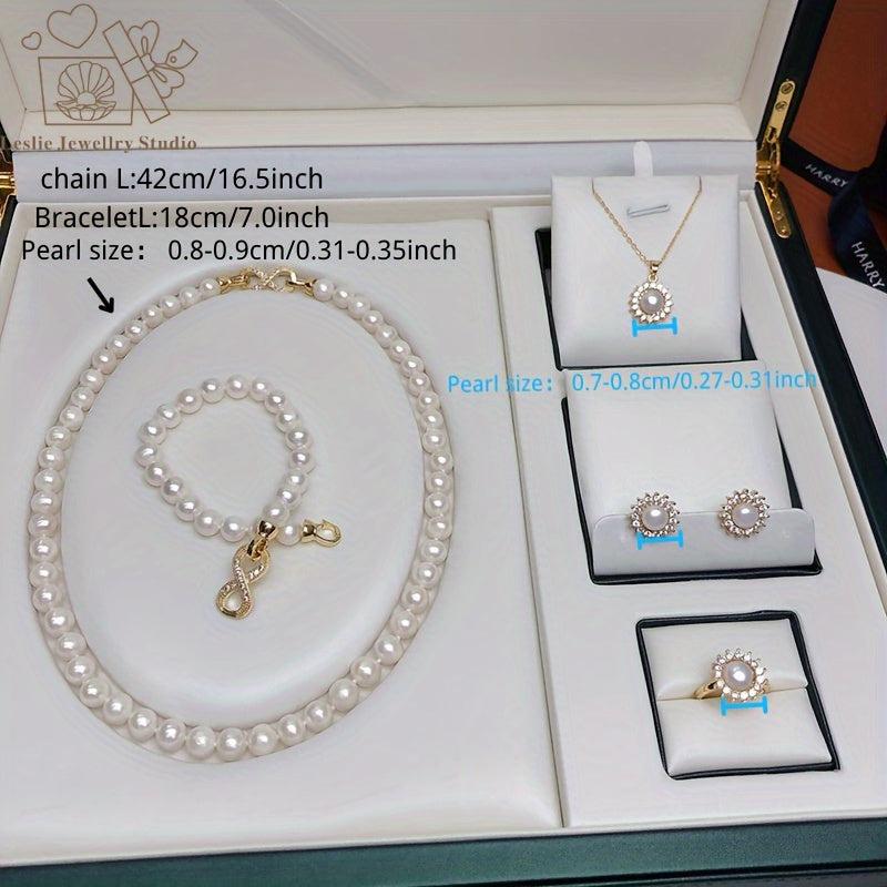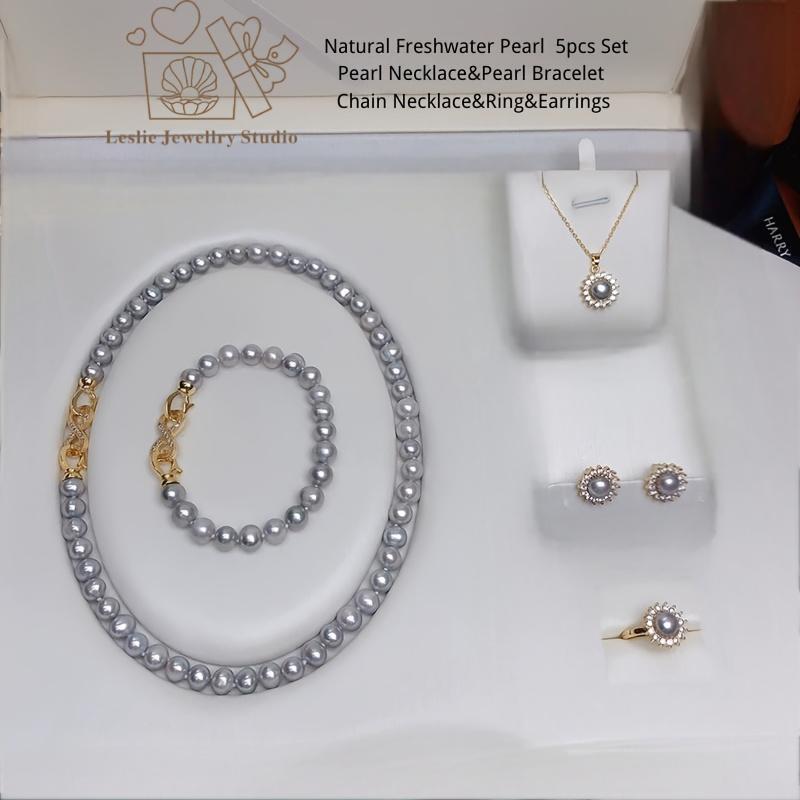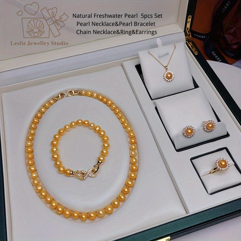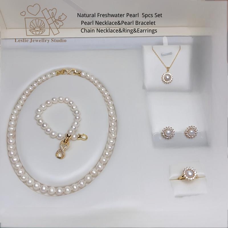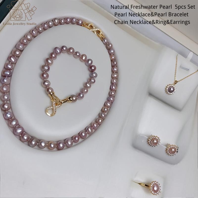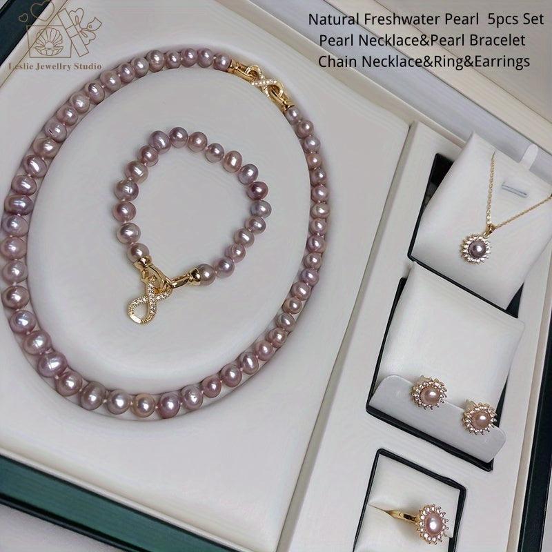 Elegant and trendy set of freshwater pearls including a necklace and bracelet. This set is a versatile addition to any woman's jewelry collection.