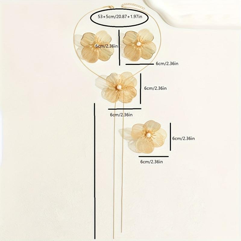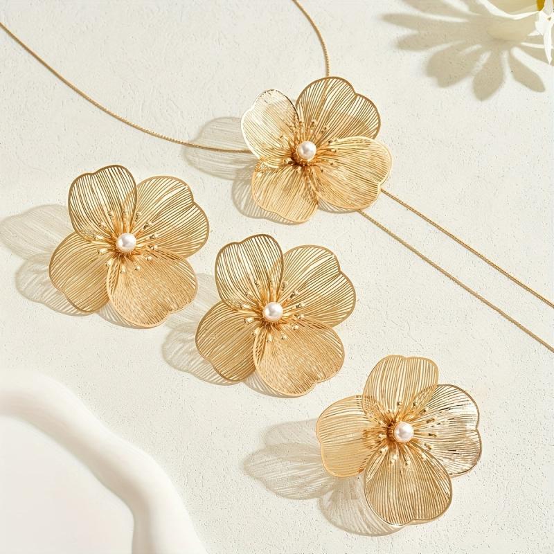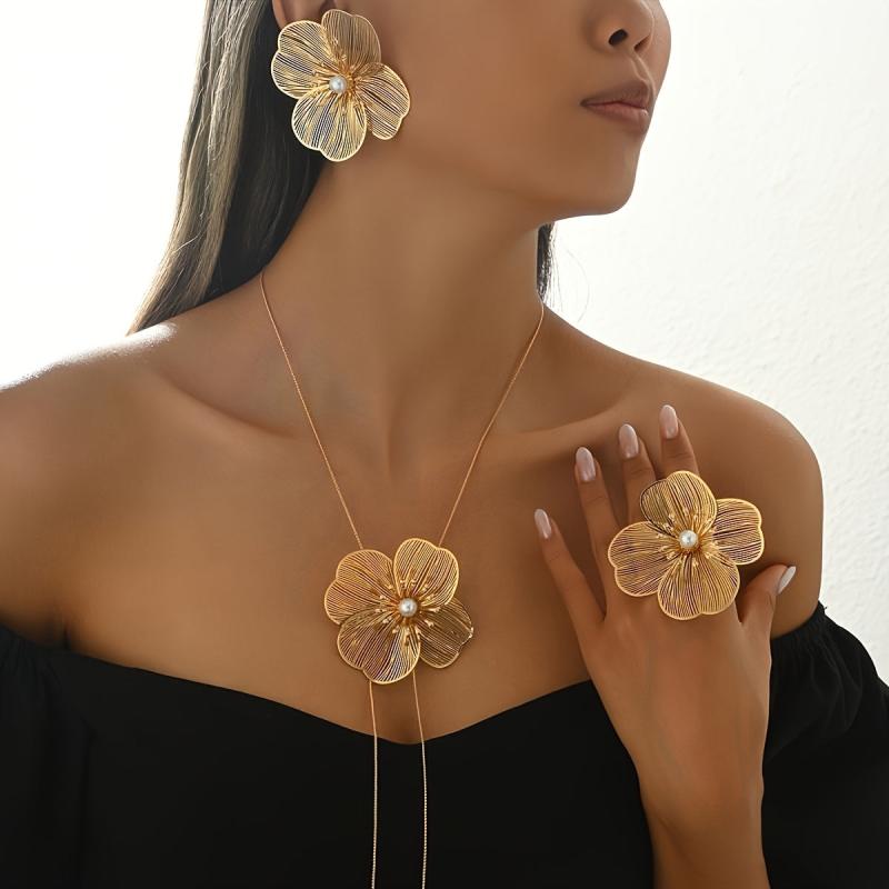 Geometric Floral Jewelry Set Golden Tone Necklace Earrings & Ring