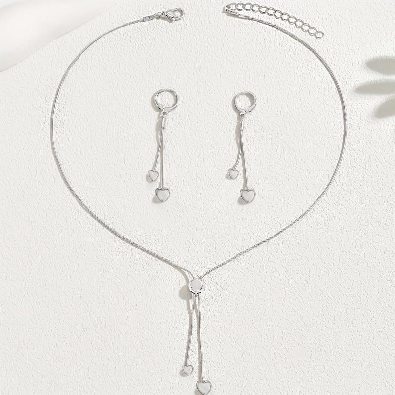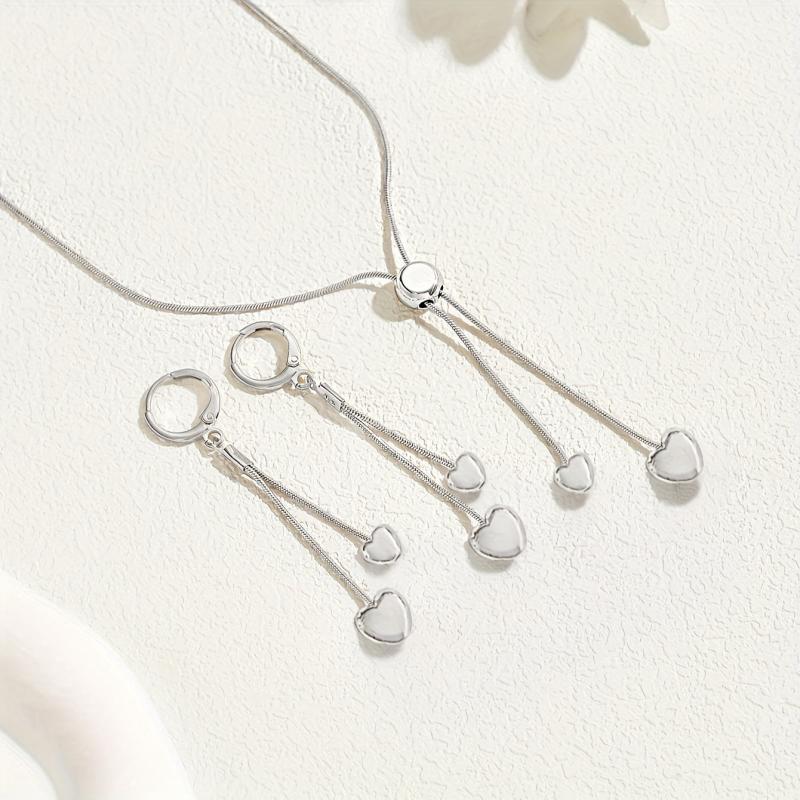 Elevate your look with this 3-piece set featuring a delicate snake chain necklace with an adjustable geometric heart pendant and tassel earrings.