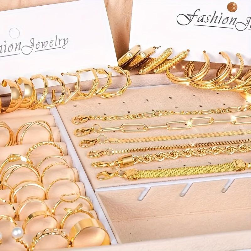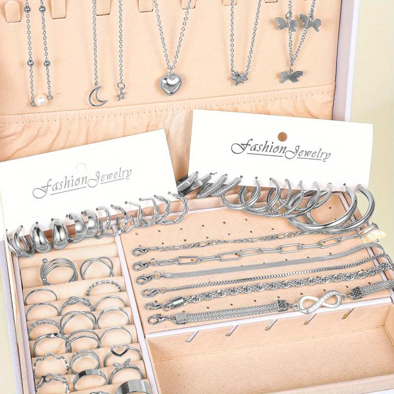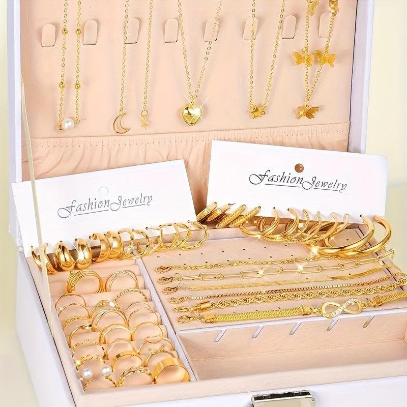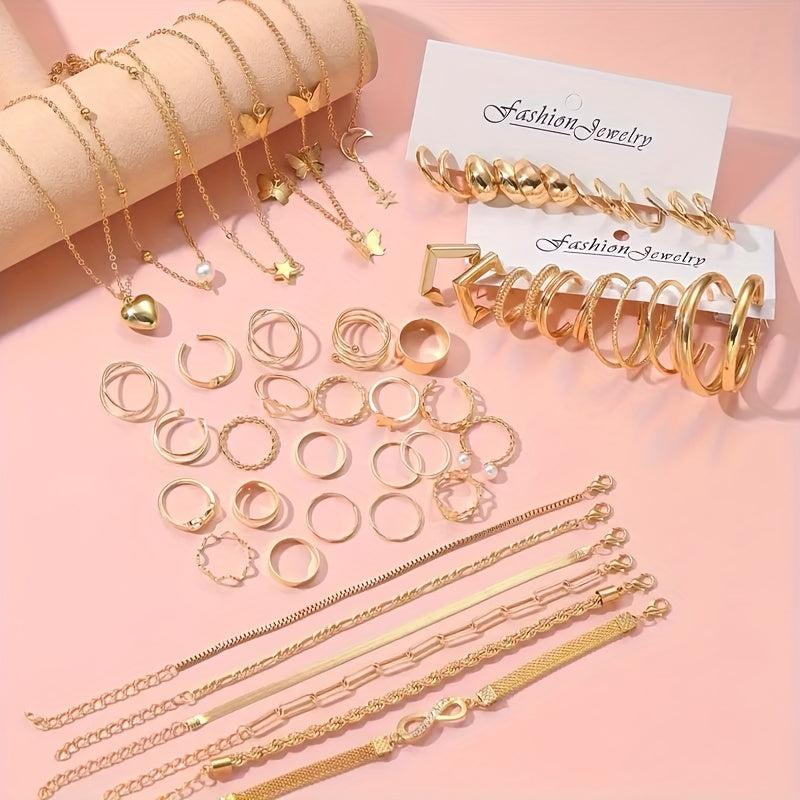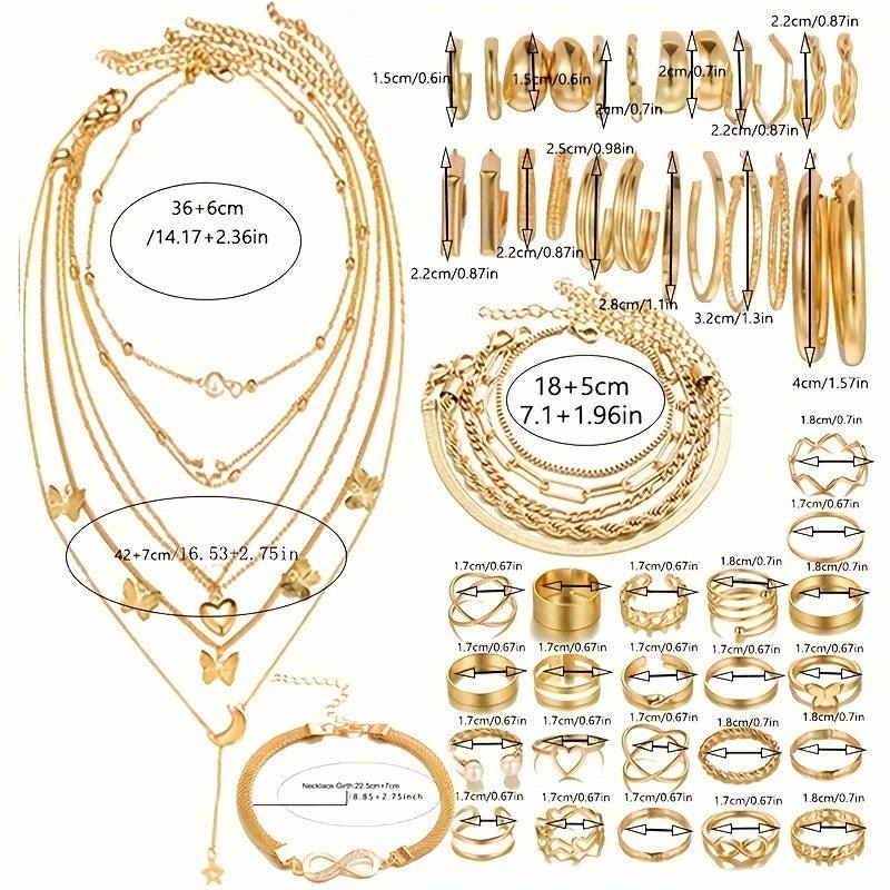 This elegant 58-piece jewelry set includes necklaces, bracelets, anklets, rings, and earrings. Perfect for daily wear, matching outfits, dating, vacation, and parties.