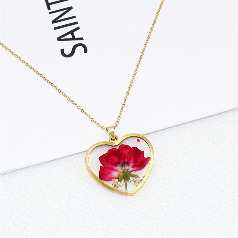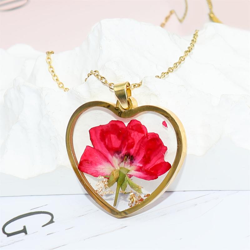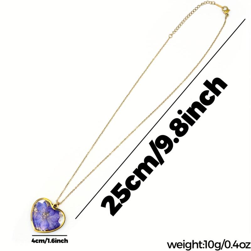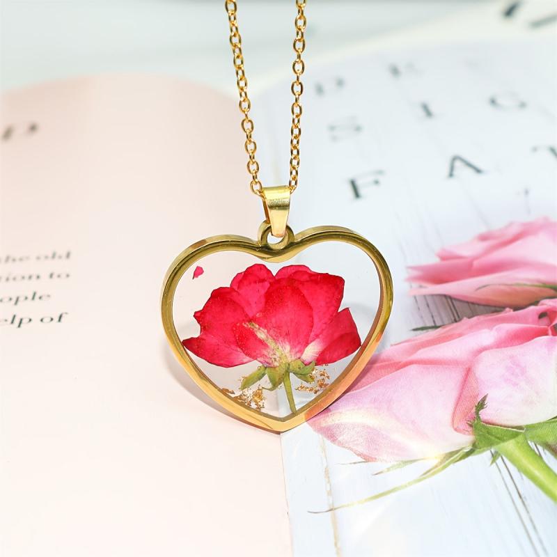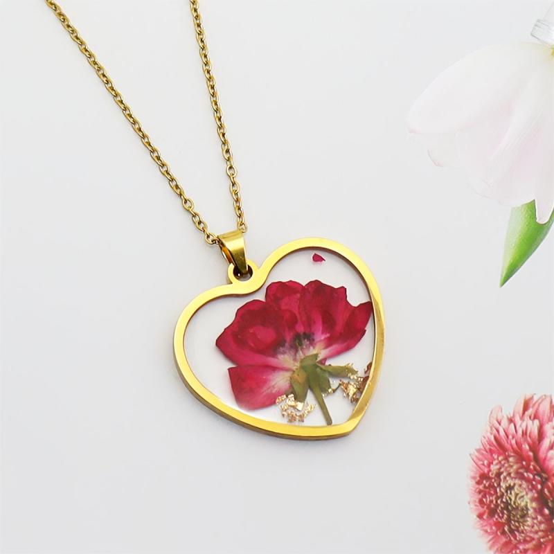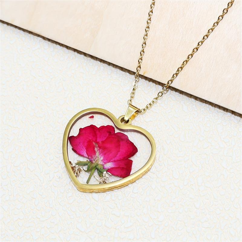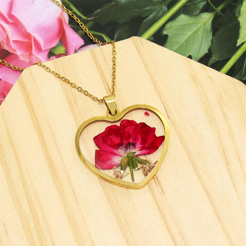 Embrace the beauty of a heart-shaped dried flower pendant necklace featuring a real gladiolus flower encased in stainless steel. Perfect for gifting or daily use.