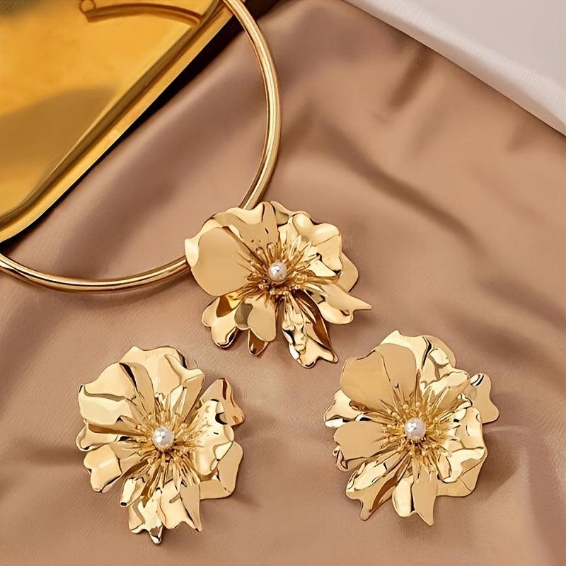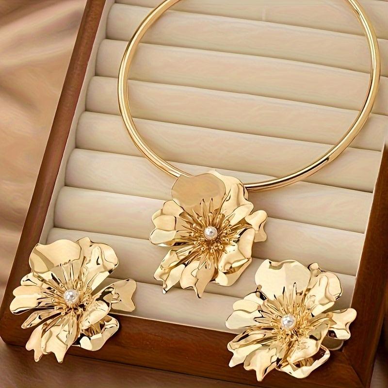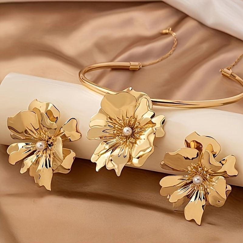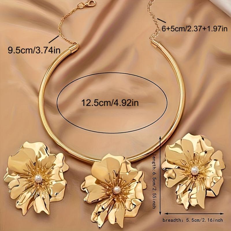 This elegant jewelry set features a choker and earrings with a golden tone floral design and faux pearl accents. Ideal for daily wear or vacation outings.
