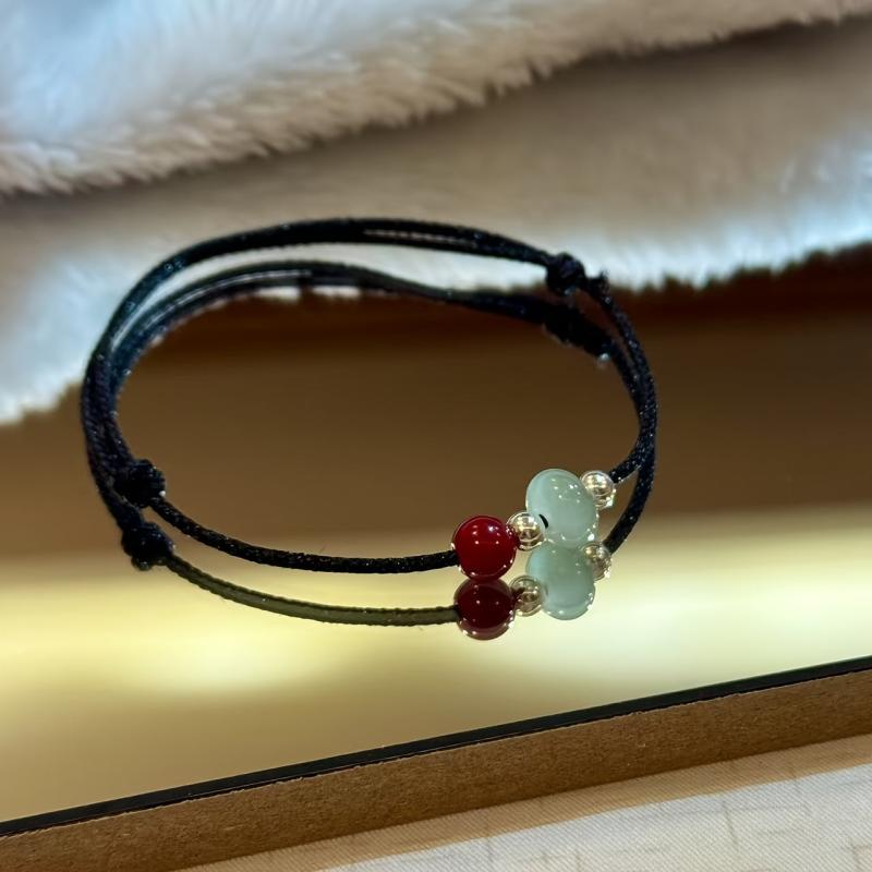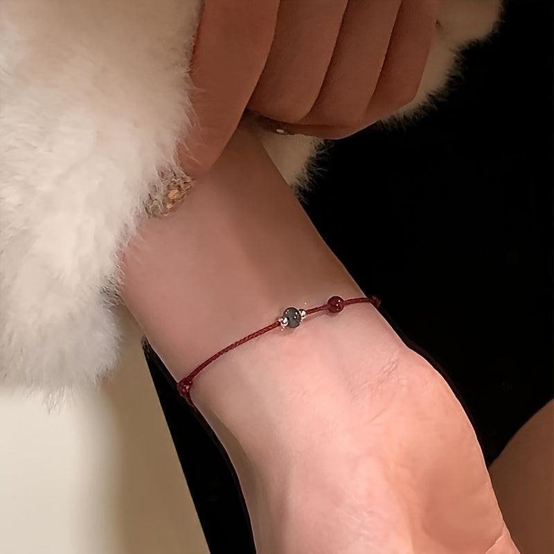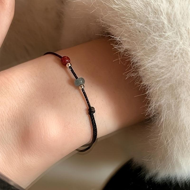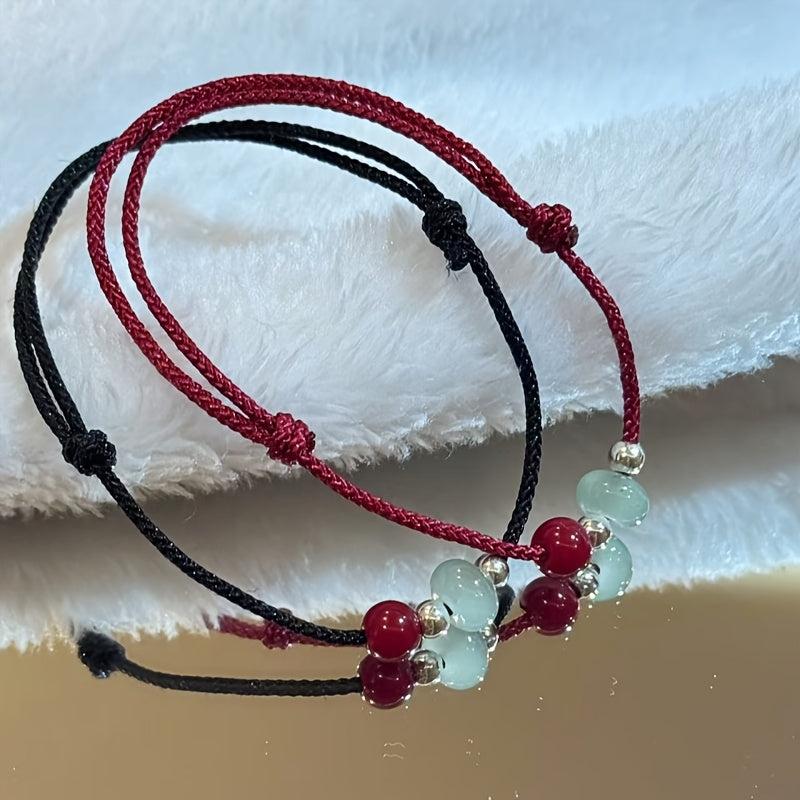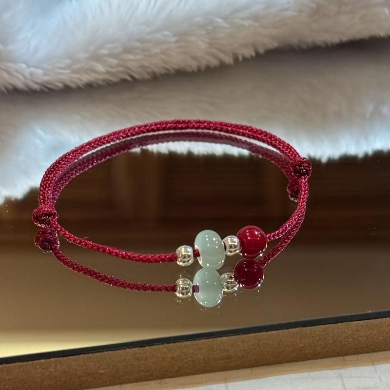 This handwoven bracelet features round faux jade beads in red color and a clear textured design. The chain length is adjustable, making it suitable for men, women, or couples. It is an ideal gift choice.