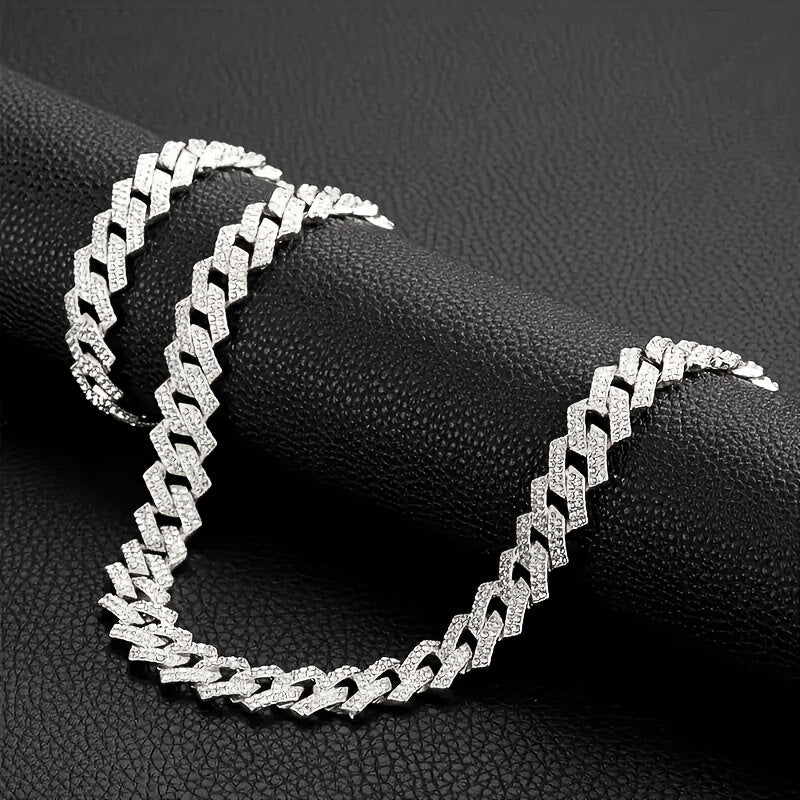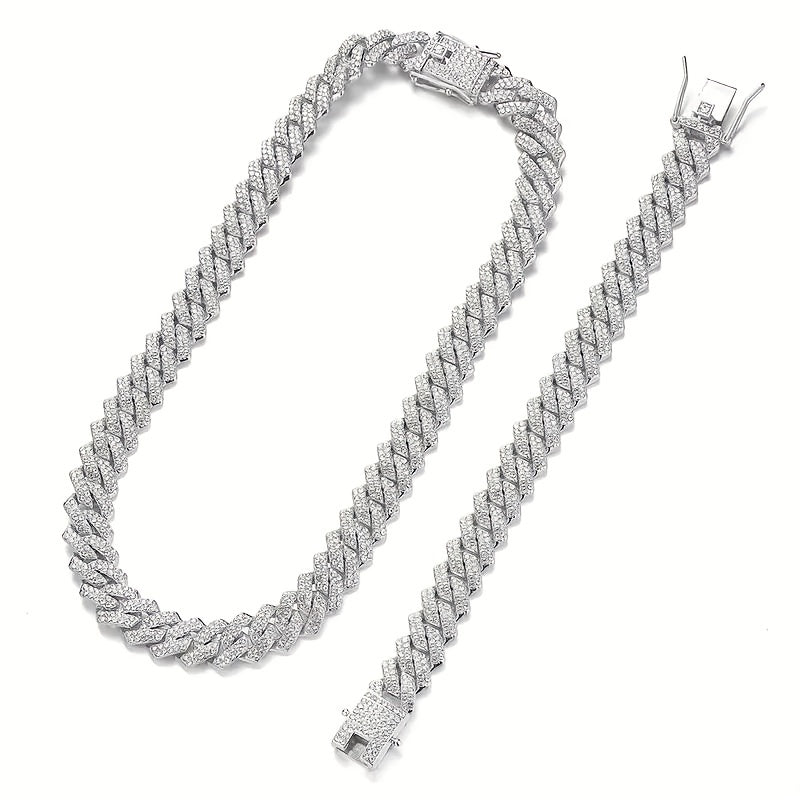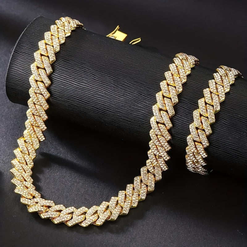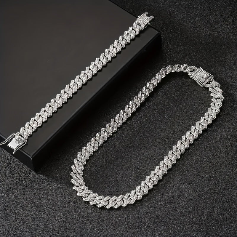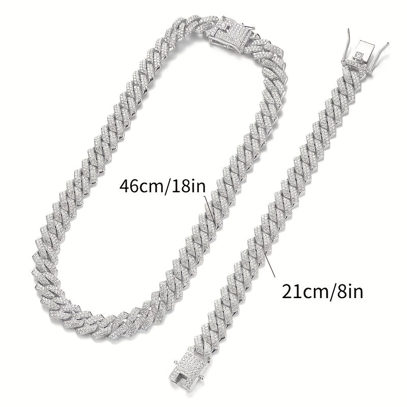 This stylish set features a zinc alloy chain necklace and bracelet with rhinestone mosaic for a trendy and eye-catching look. Perfect gift for those who love personality-style jewelry.